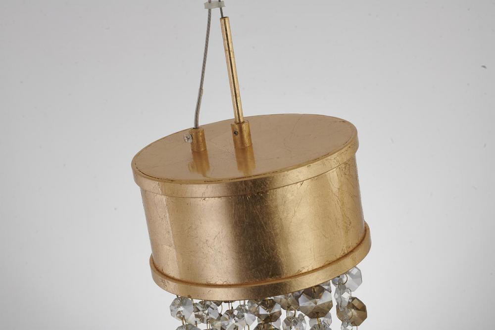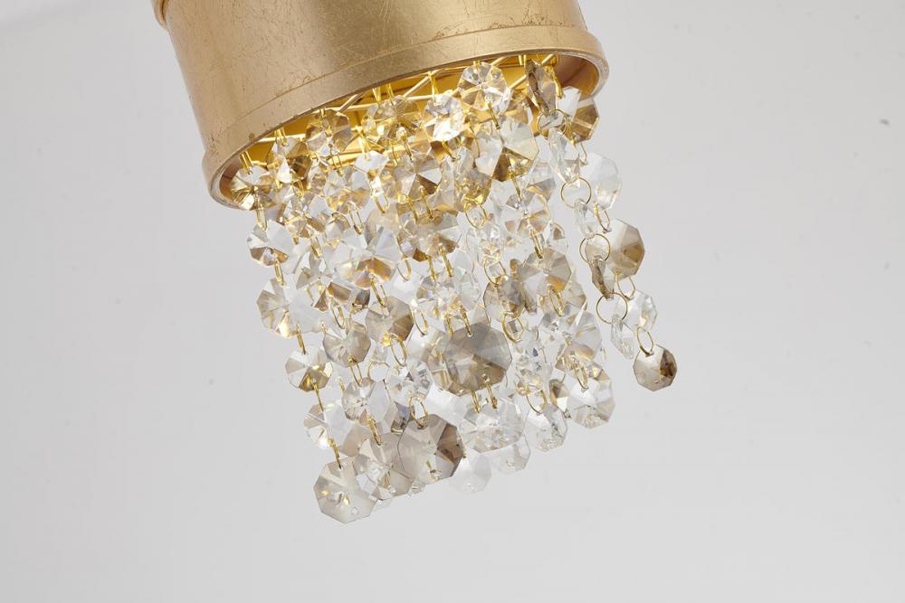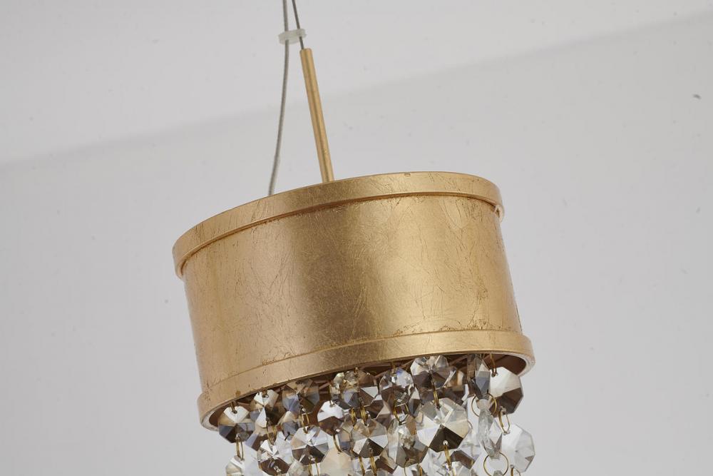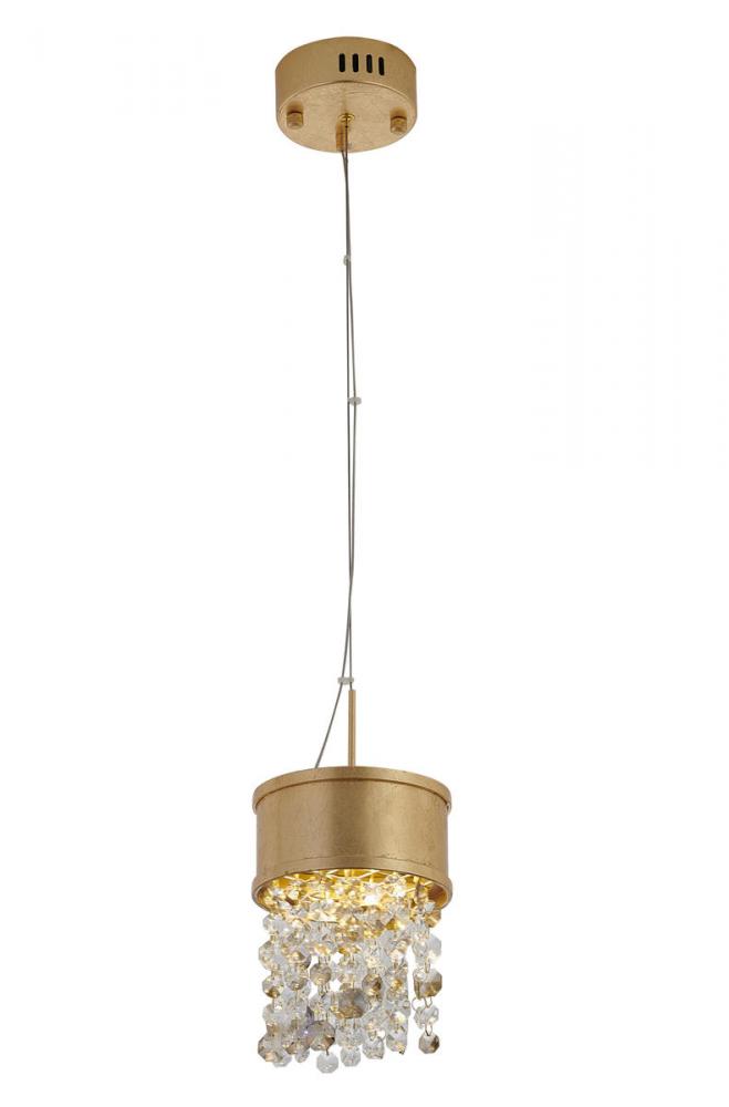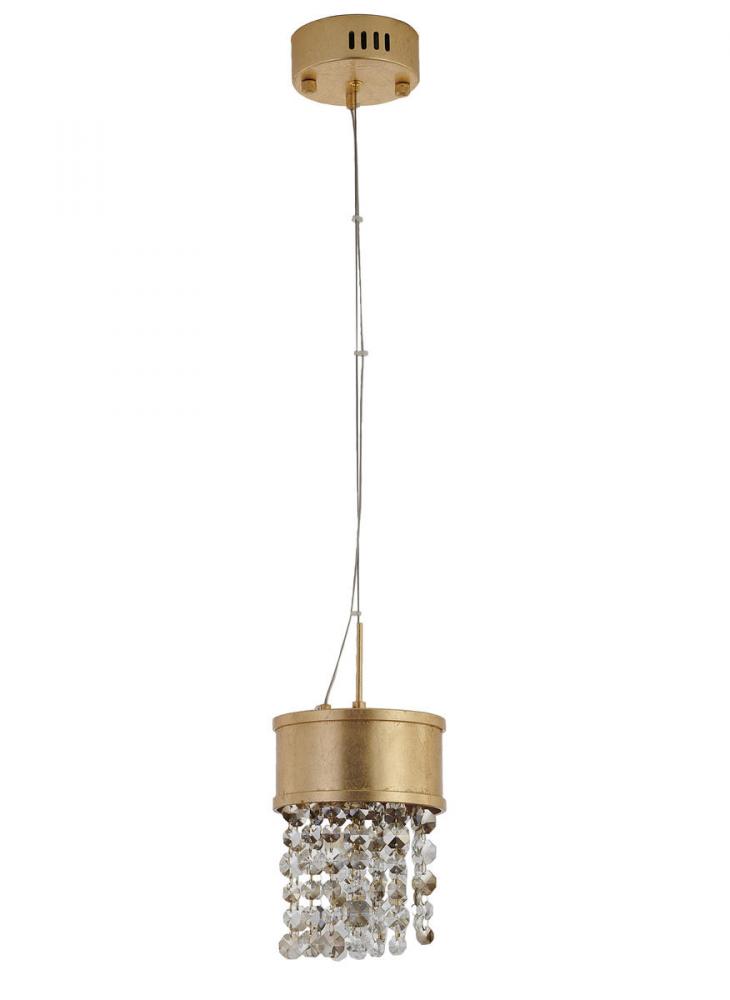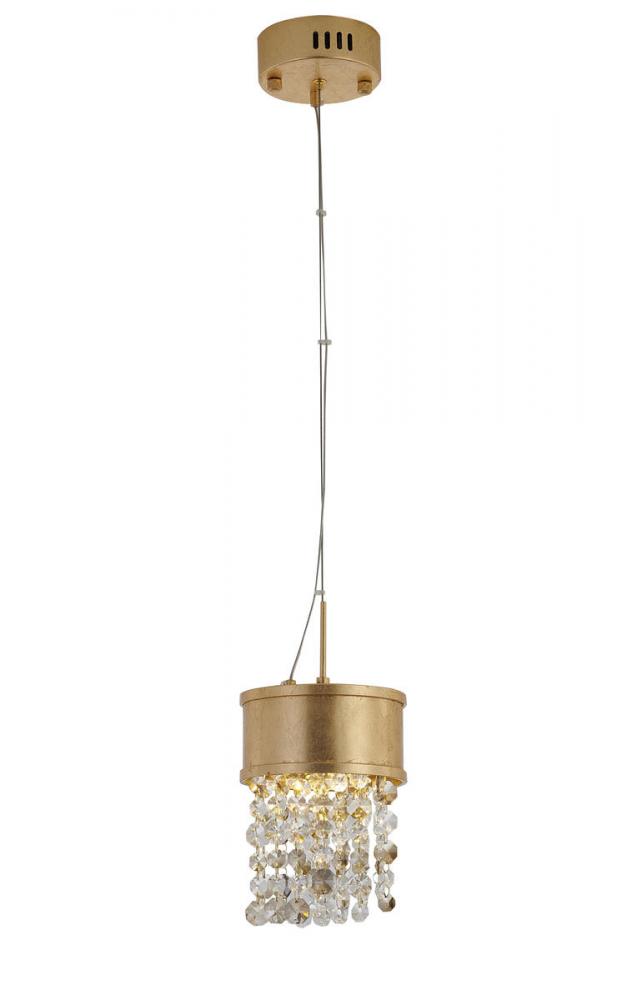 This exquisite LED single pendant is in a gold finish. The frame is made out of metal, and it comes with clear and champagne hanging crystals. The LED bulb is integrated into the frame. You can create a timeless feel while using modern forms