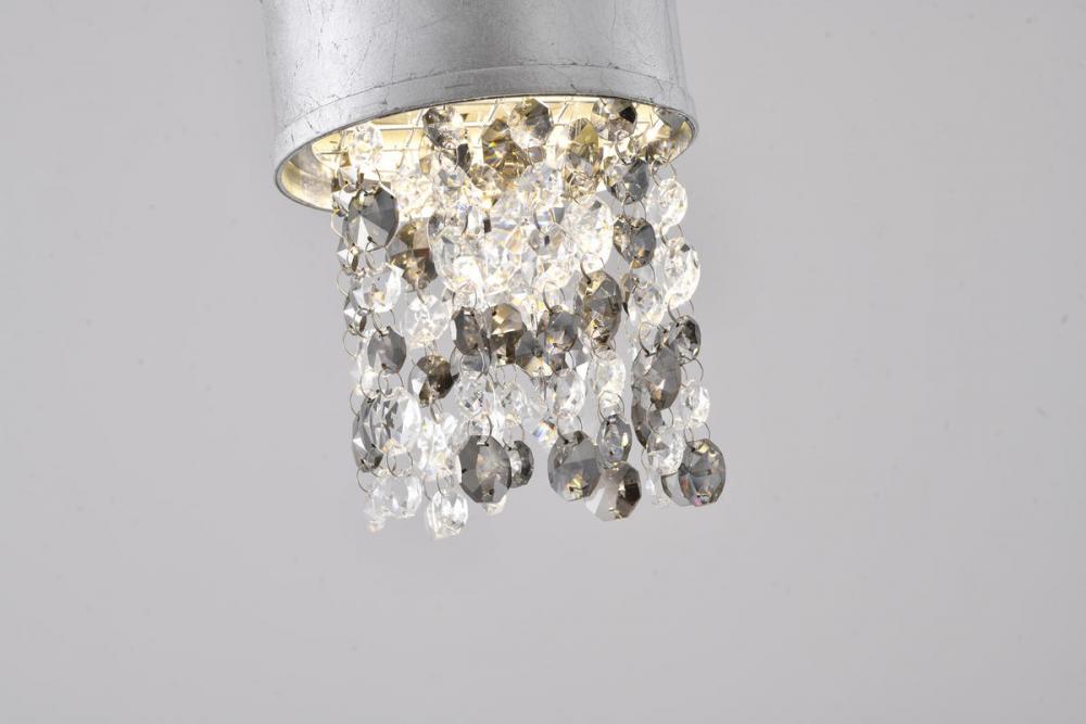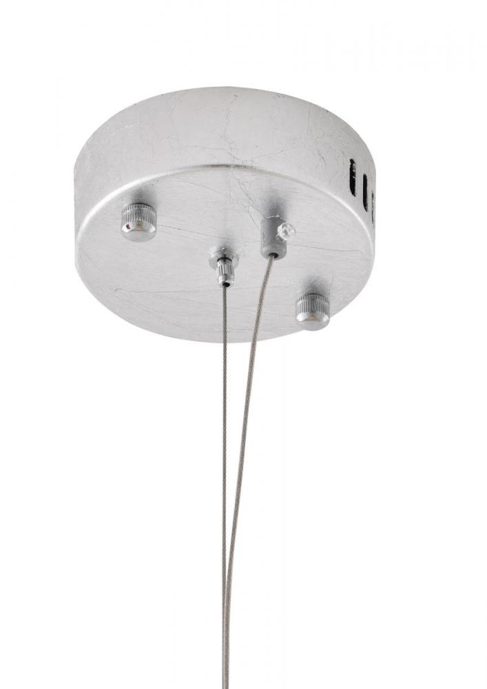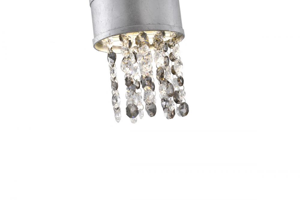This exquisite LED pendant is in a silver finish. The frame is made out of metal, and the LED bulb is integrated into the frame. It also comes with clear and smoke hanging crystals. The adjustable cord link makes this fixture suitable for most ceiling heights.