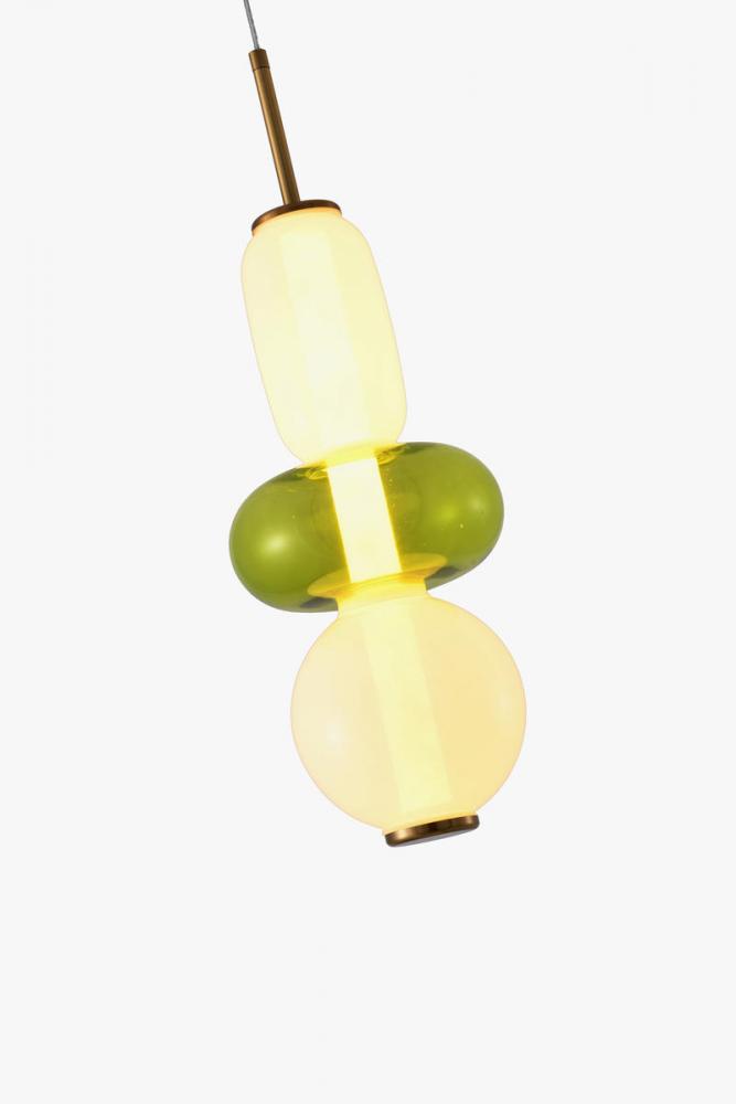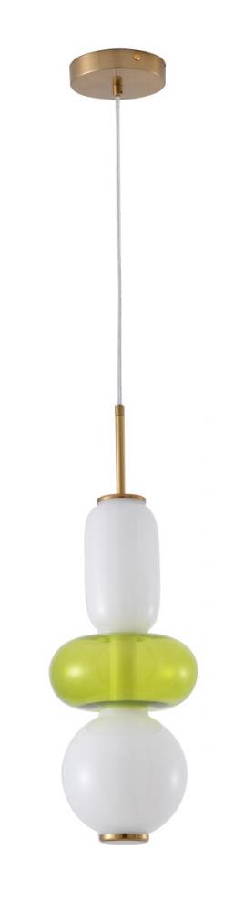 This exquisite LED pendant is in a gold finish. The frame is made out of metal, and it comes with a white and green glass shade. The LED bulb is integrated into the frame. The adjustable cord link makes this fixture suitable for most ceiling heights.