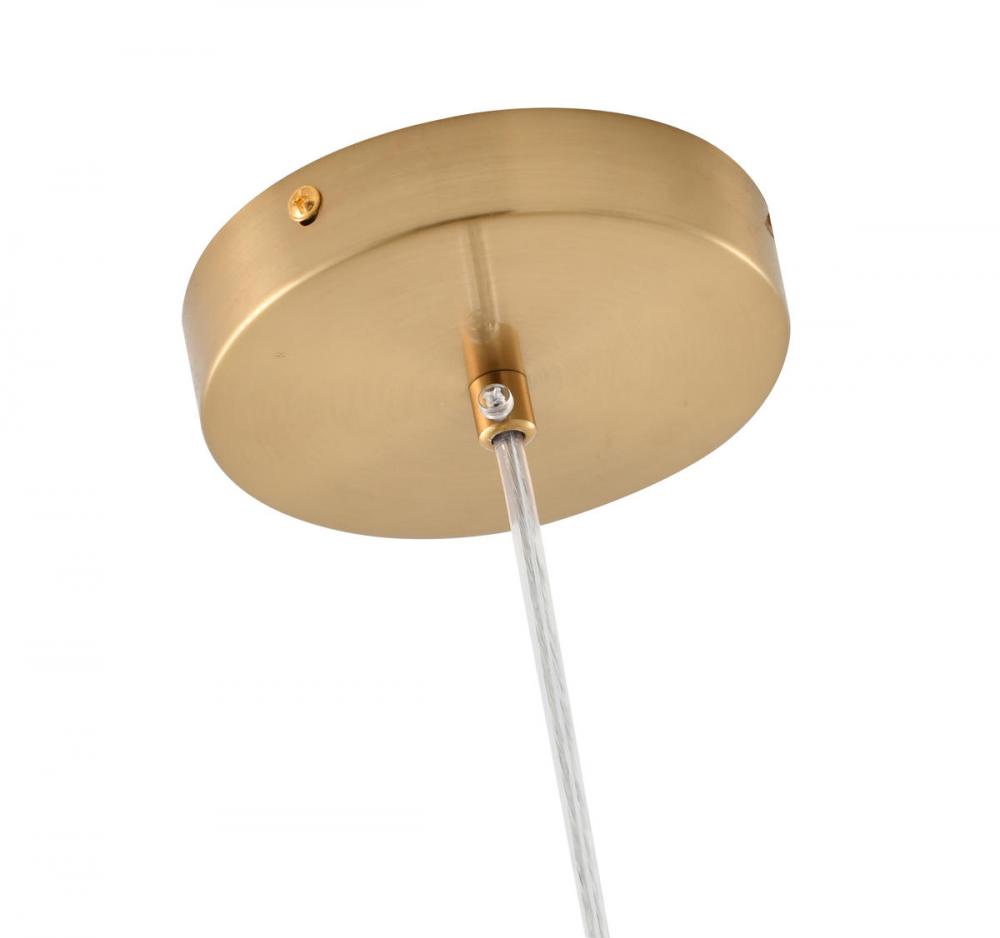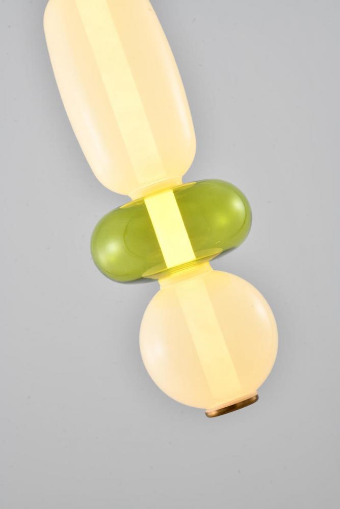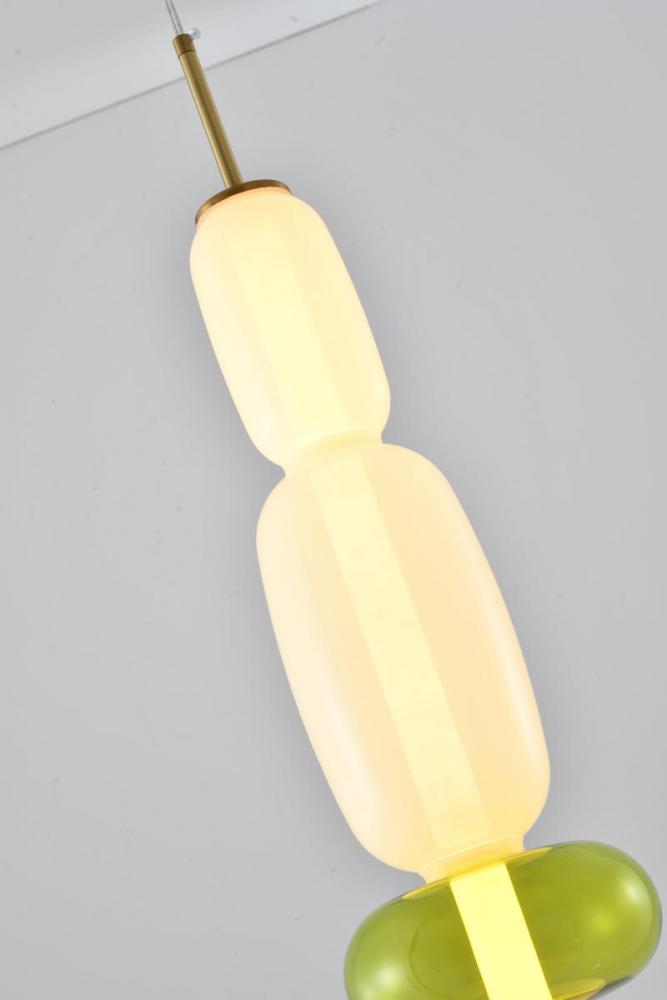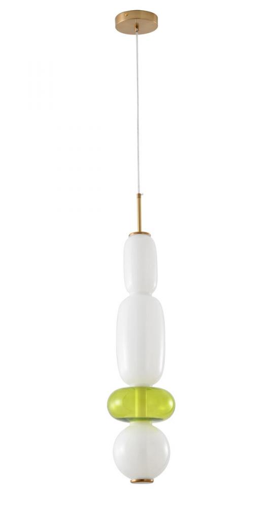 This exquisite LED pendant is in a gold finish. The frame is made out of metal, and it comes with a white and green glass shade. The LED bulb is integrated into the frame. The adjustable cord link makes this fixture suitable for most ceiling heights.