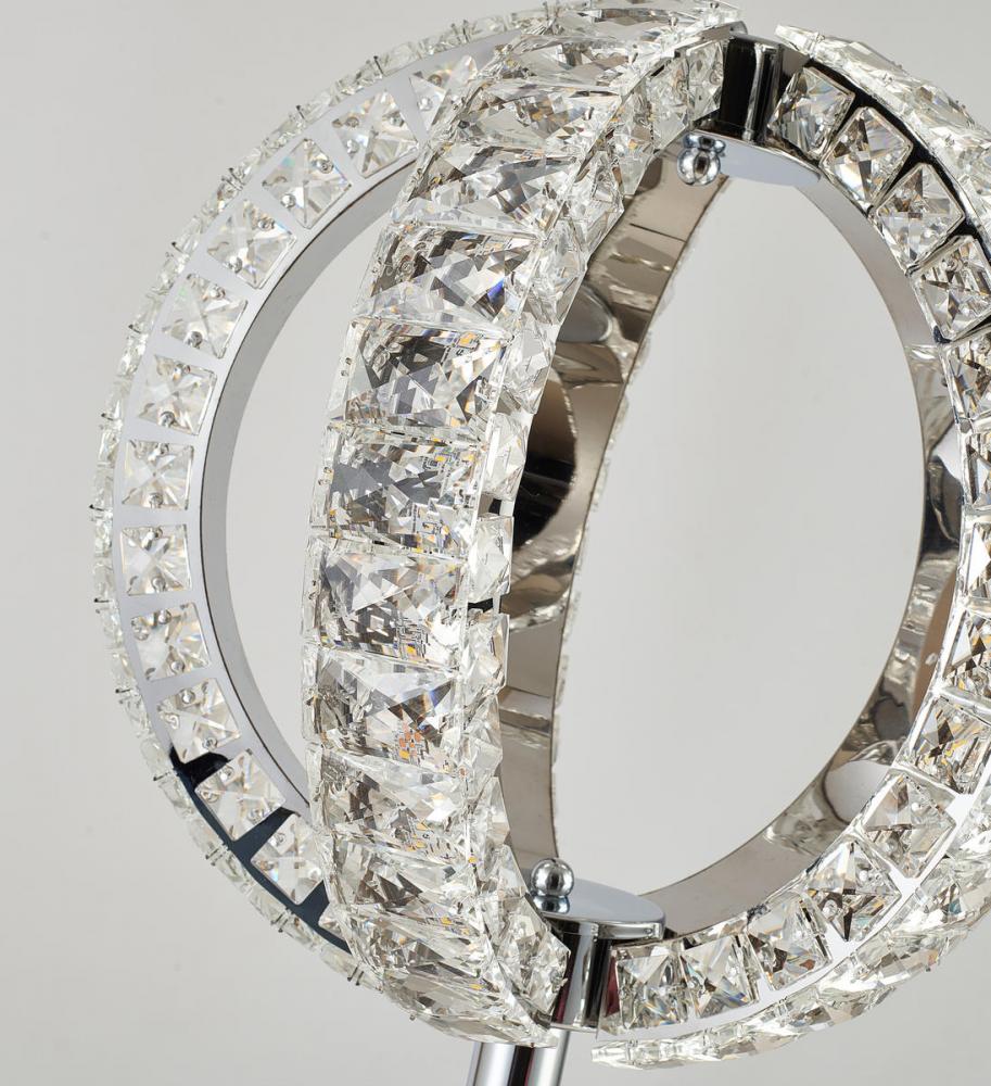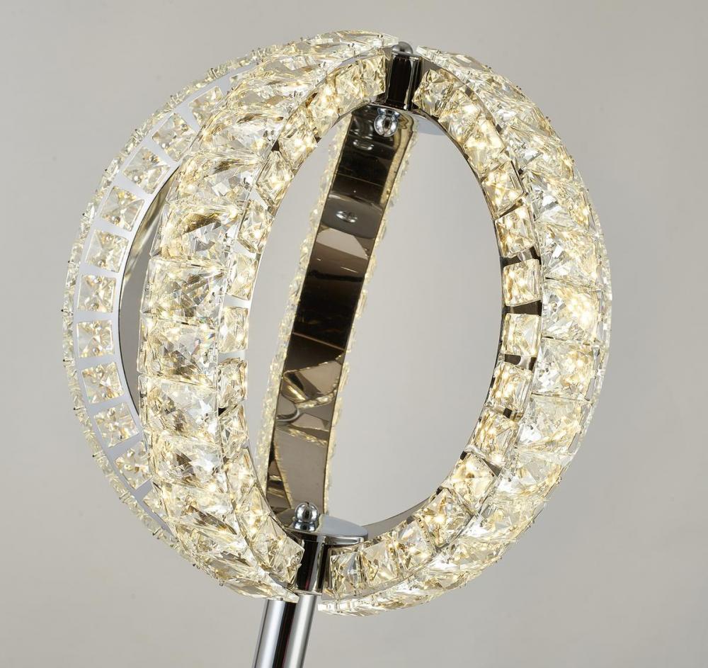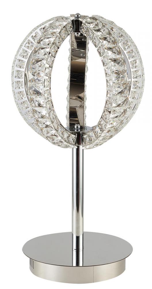 This exquisite dimmable LED table lamp is in a chrome finish. The base is made out of metal, and it comes with a metal frame in an ORB shape with clear crystal accents. The LED bulbs are integrated into the frame.