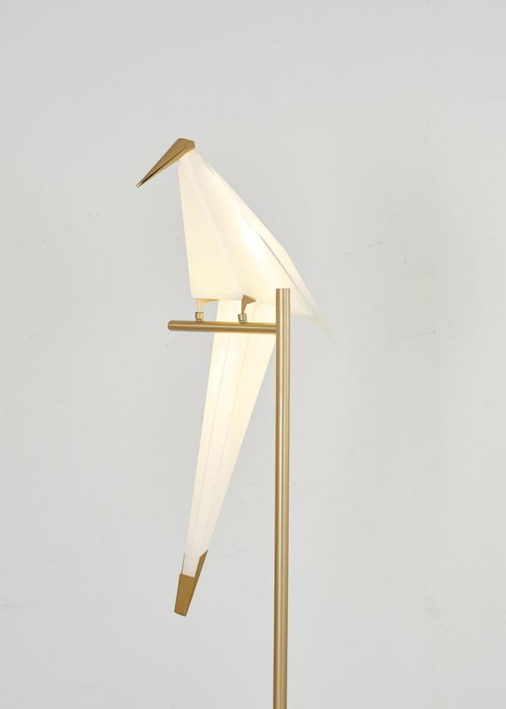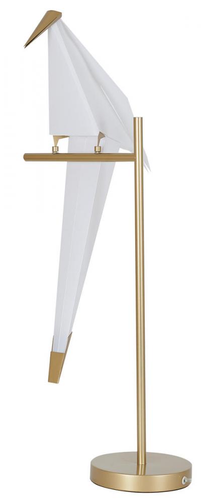 This unique LED table lamp contains a gold carbon steel frame and one white plastic birds. The bird can be swung back and forth, and the bird is detachable and can turn light ON/OFF. It is great for chair side reading or general room illumination.