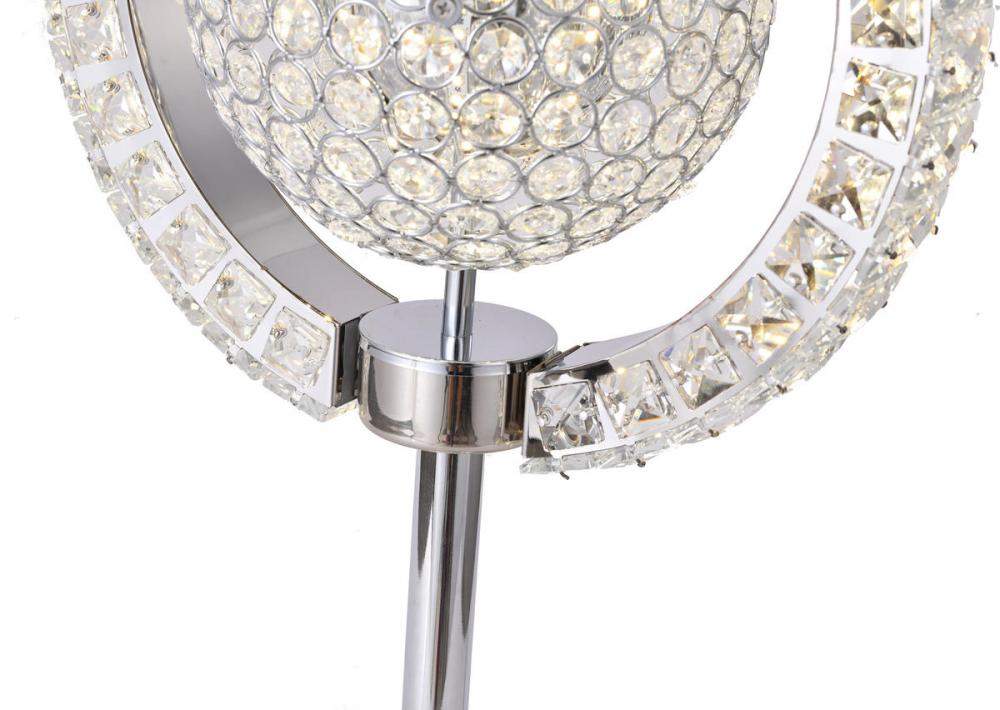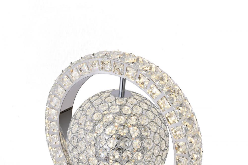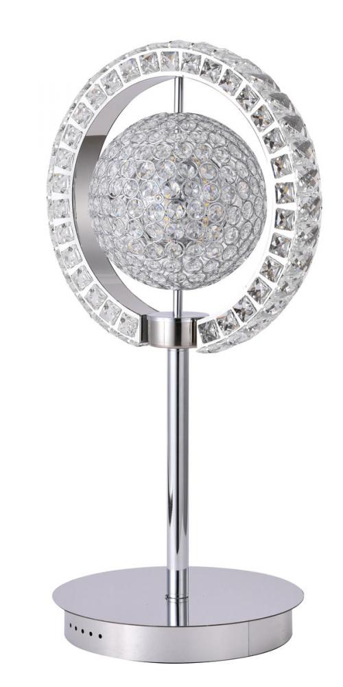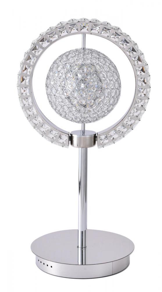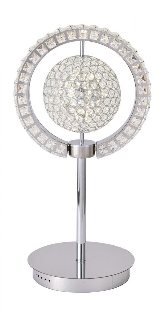 This exquisite LED table Lamp is in a chrome finish. The frame is made out of metal, and it comes with clear crystal accents. The LED bulbs are integrated into the frame, and it also comes with a plug in dimmer switch.