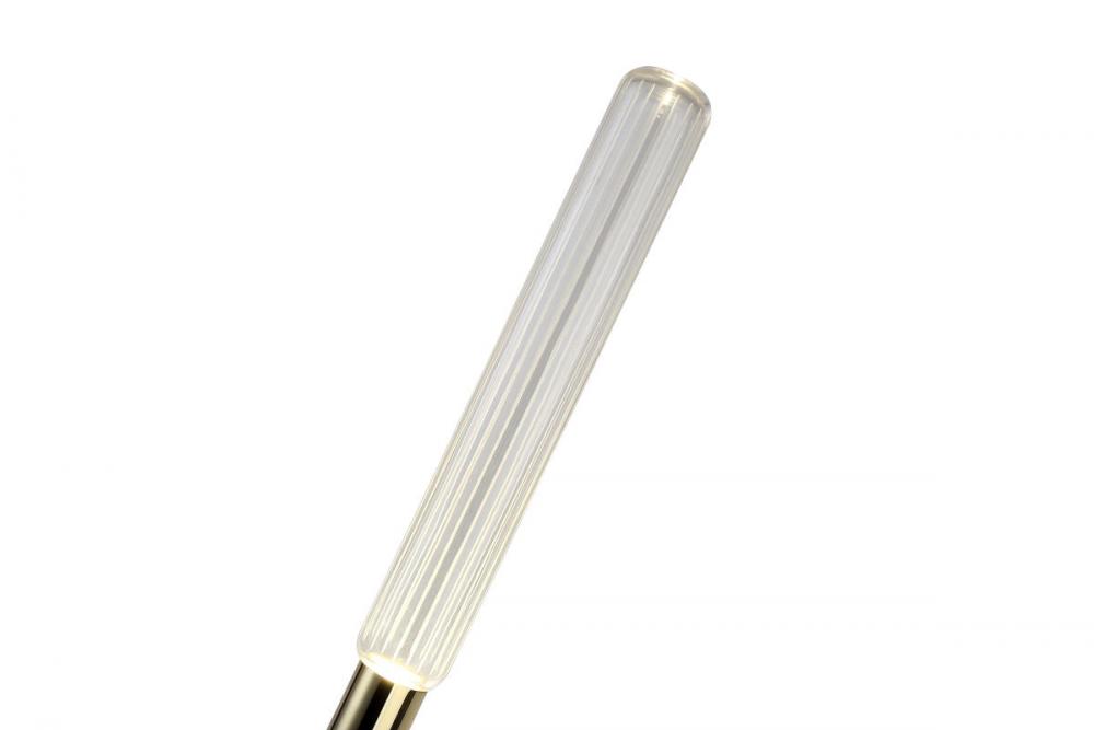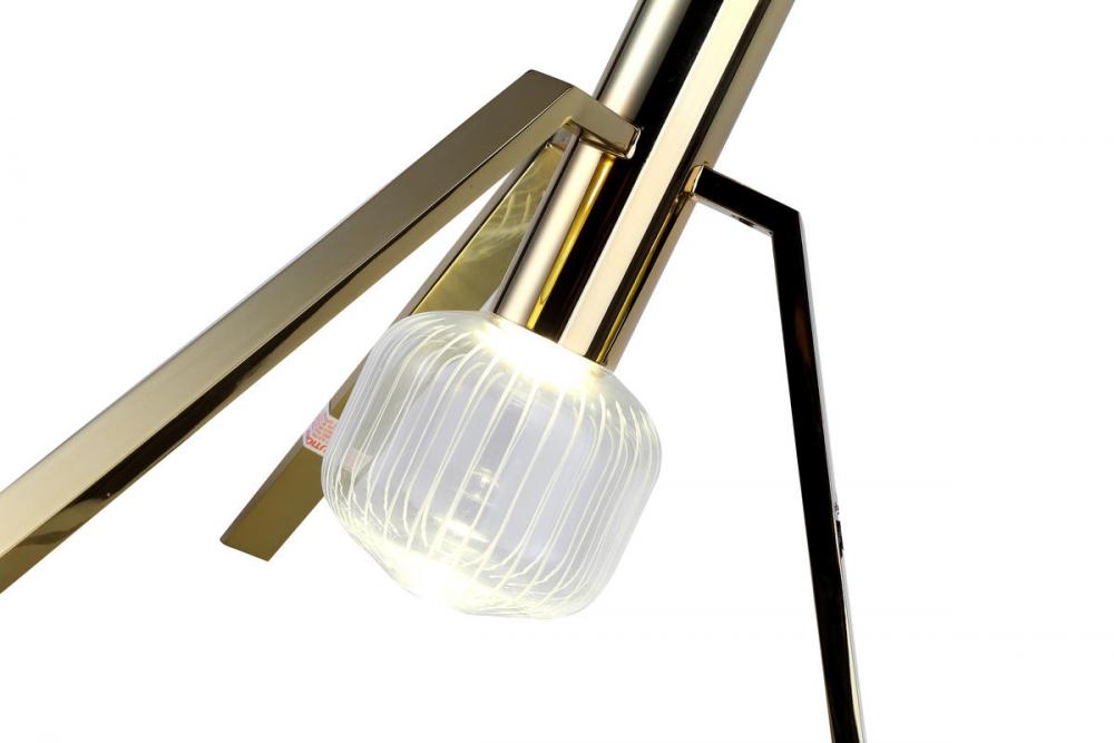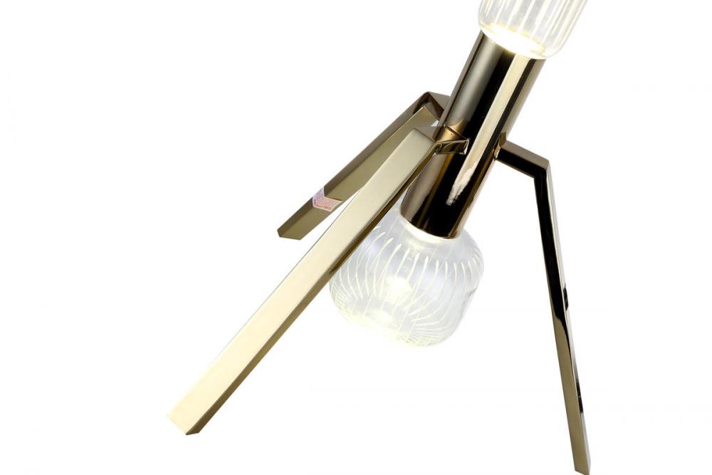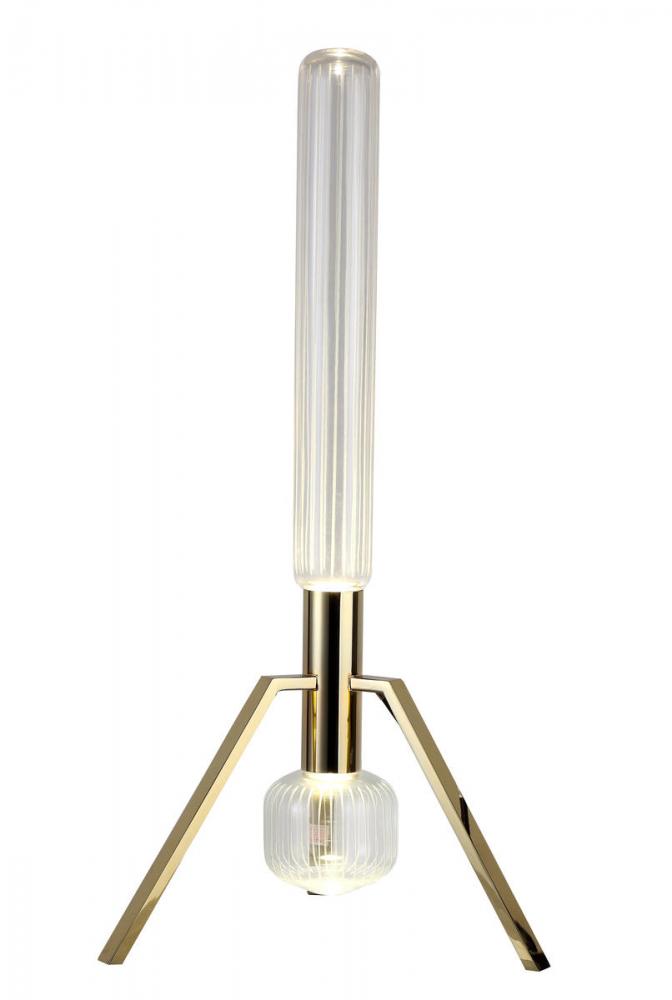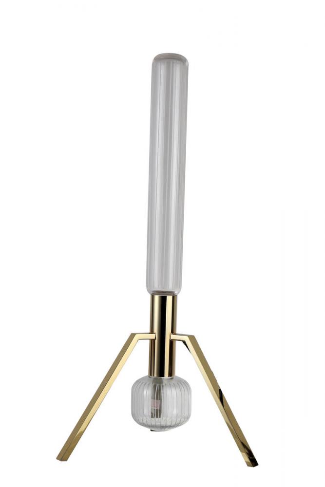 This unique LED table lamp is in a gold finish. The frame is made out of metal, and the LED bulbs are integrated into the frame. It comes with clear glass shade. It is great for chair side reading or general illumination in any rooms.