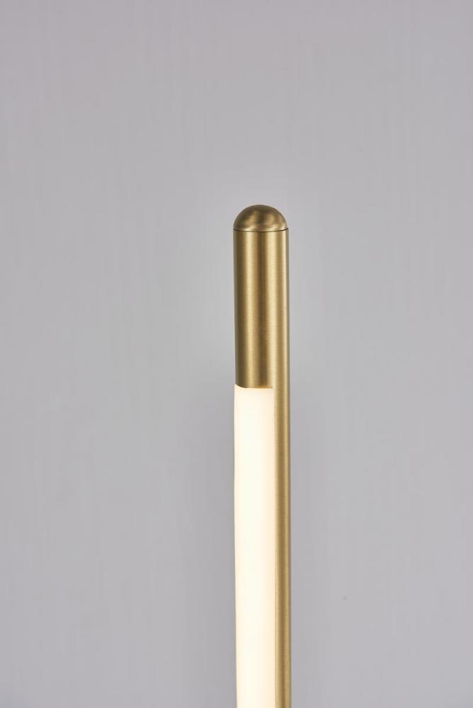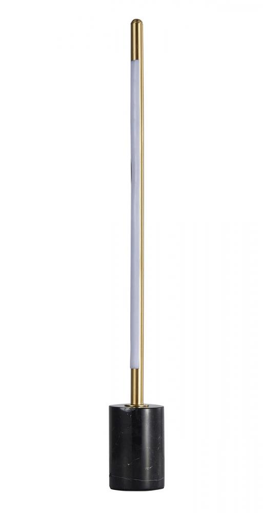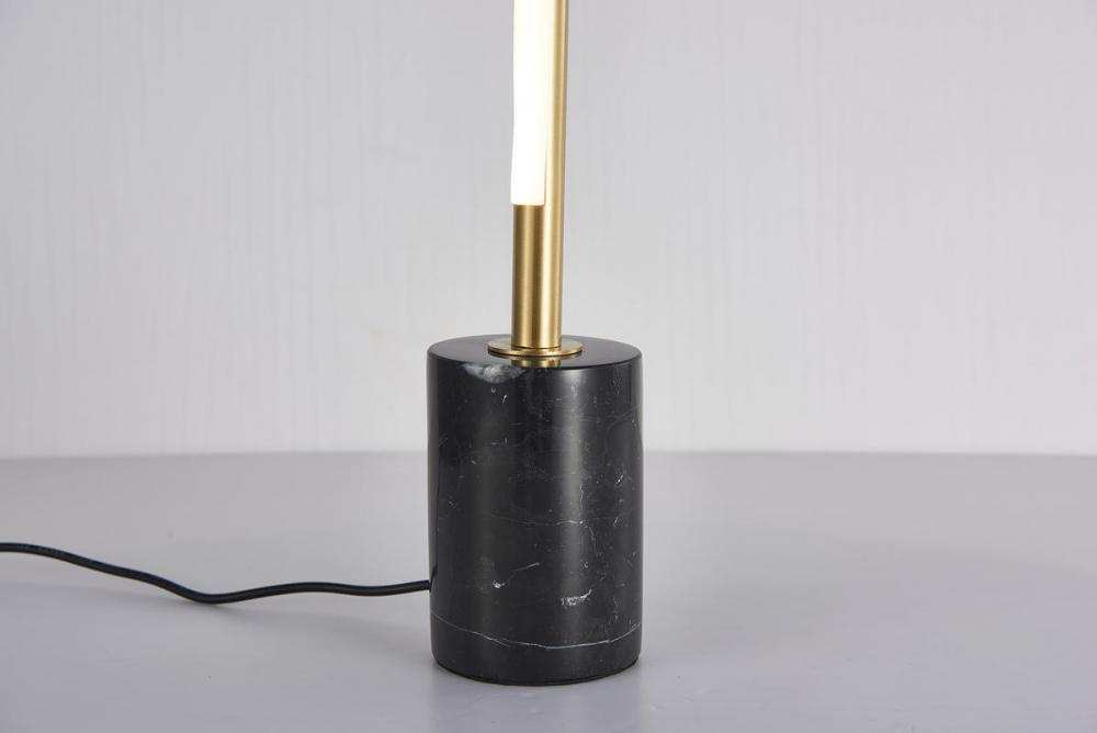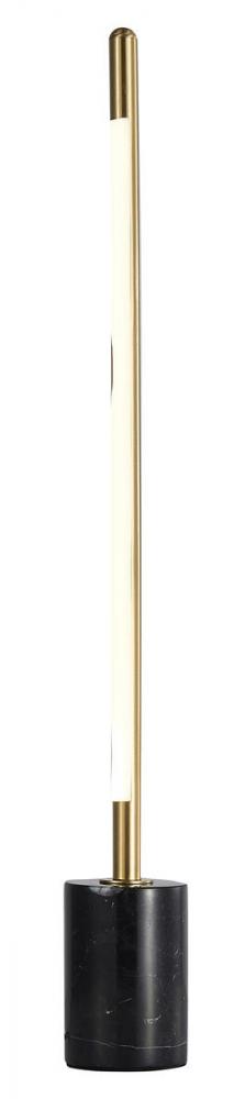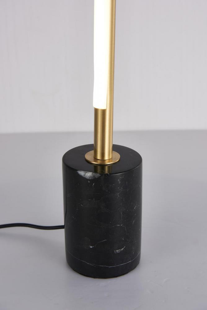 This LED table lamp is in a brass and black finish. The frame is made out of stainless steel, and the LED bulb is integrated into the frame. It also comes with a black marble base and silicone diffuser. It is great for chair side reading or general illumination in any rooms.