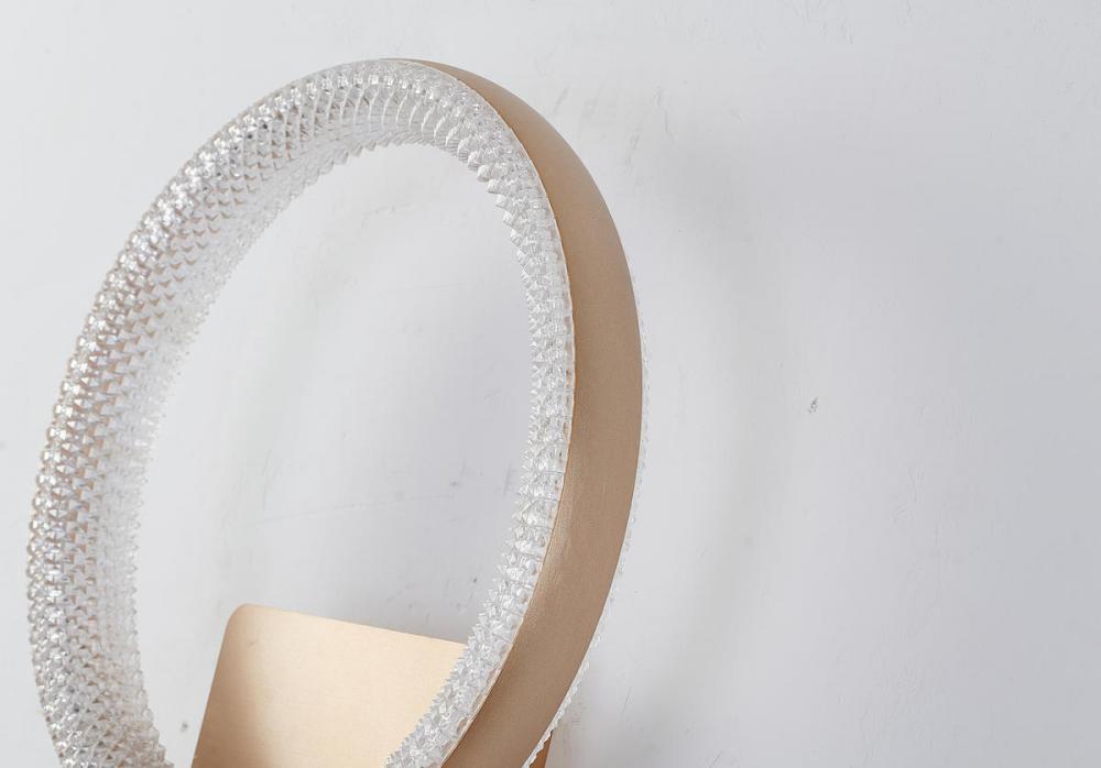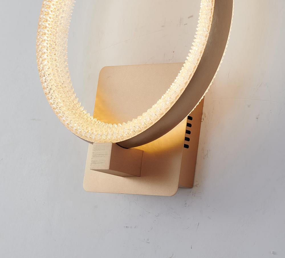 This exquisite LED wall sconce is in a gold finish. The frame is made out of iron, and it comes with a clear diffuser. The LED bulb is integrated into the frame. It can be used in any room, entryway, and more.