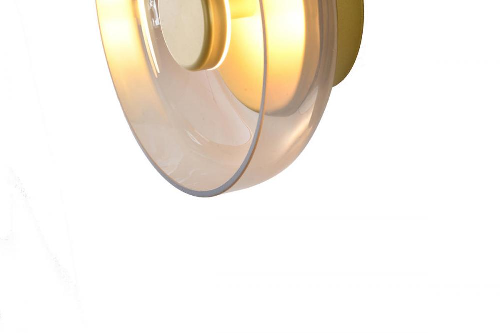 This LED wall sconce is in a gold finish. The frame is made out of metal, and the it comes with an amber glass shade in a round shape. The LED bulb is integrated into the frame. It can be used in any rooms, entryways, and more
