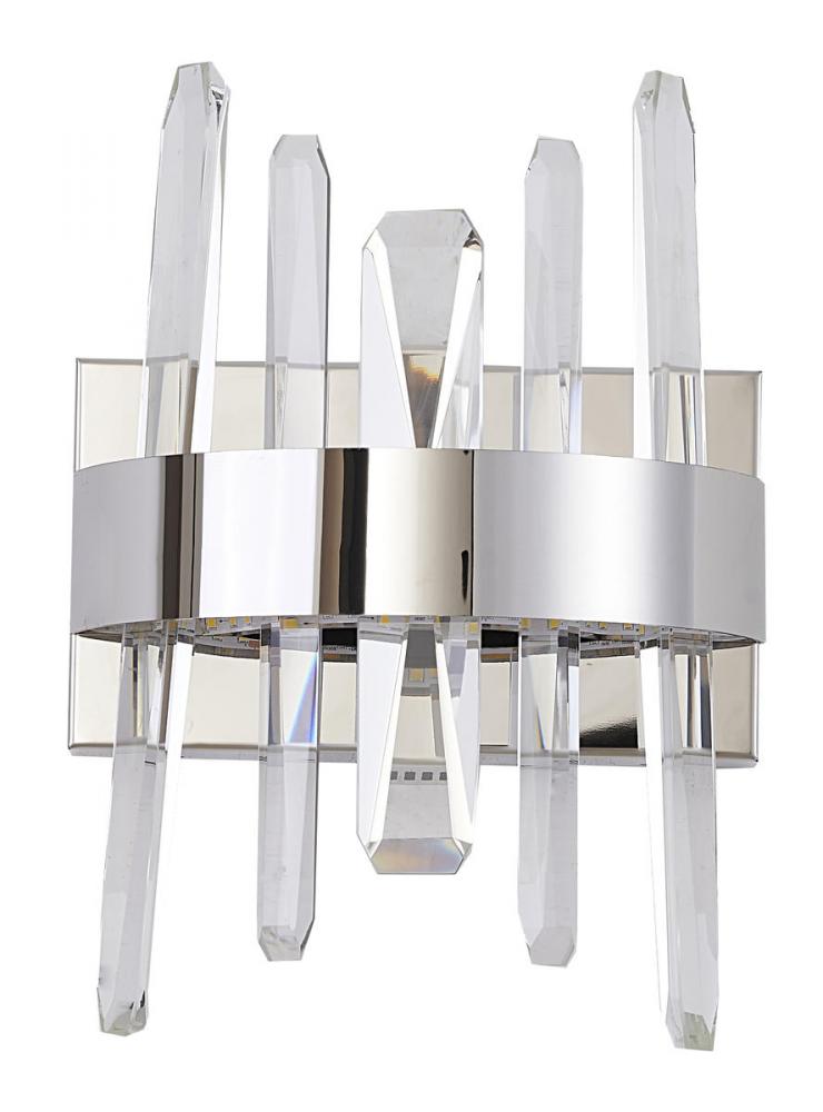 This exquisite LED wall sconce is in a chrome finish. The frame is made out of stainless steel, and it comes with clear crystals. The LED bulbs are integrated into the frame. It can be used in any rooms, entryways, and more.