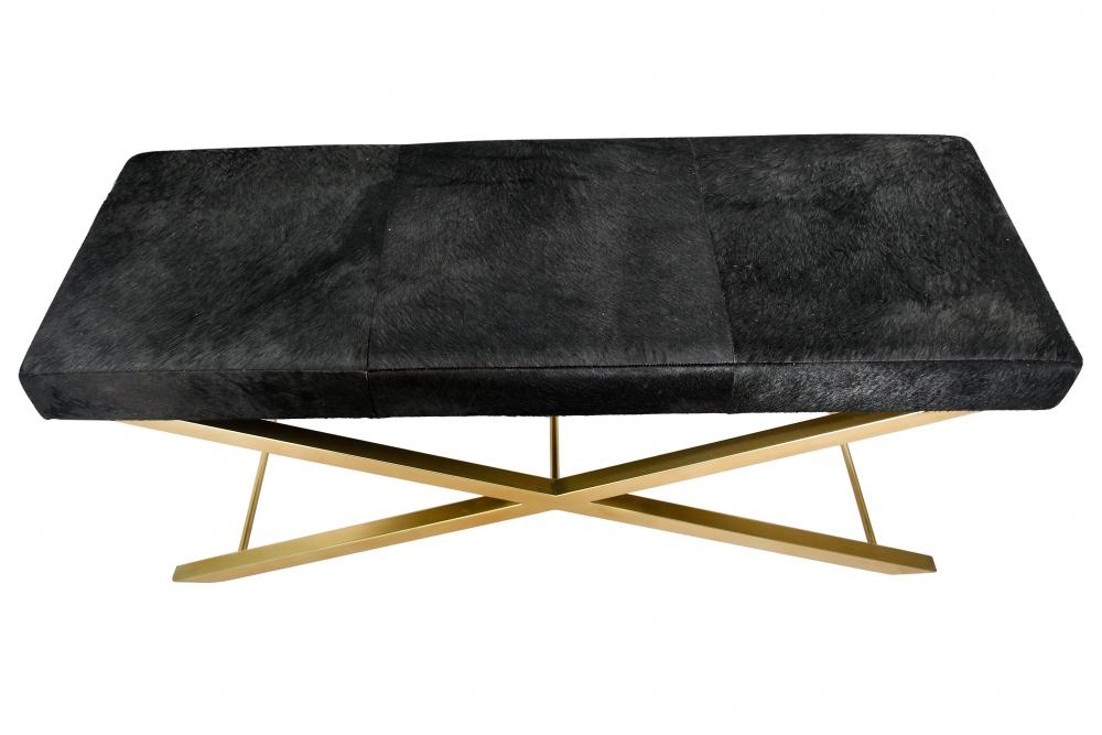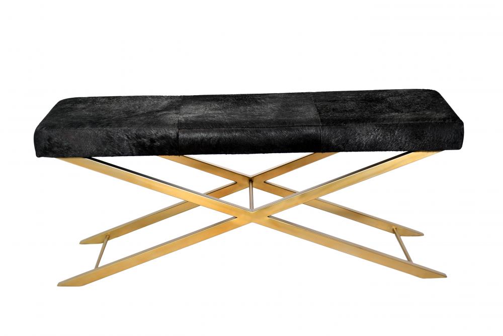 This bench is a gold stainless steel frame bench. It comes with a solid black hairline leather. The materials for this bench consists of cow hide fur and metal.