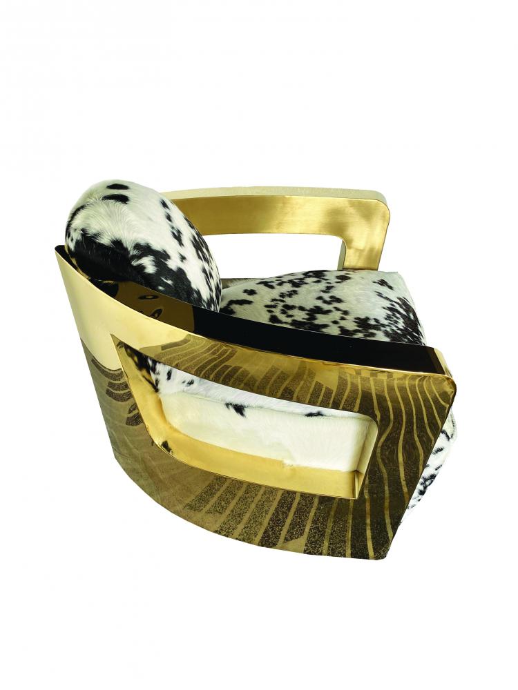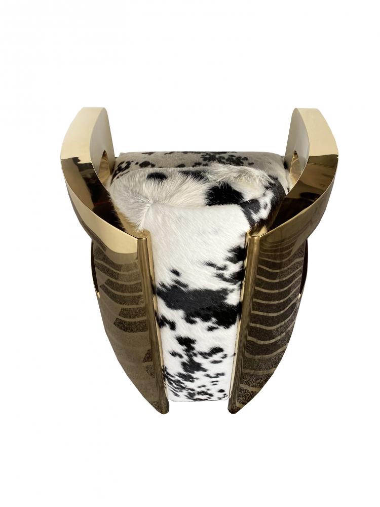 This chair is a gold frame aviator chair. It comes with a black and white cowhide cover. The materials for this chair consists of leather and stainless steel.