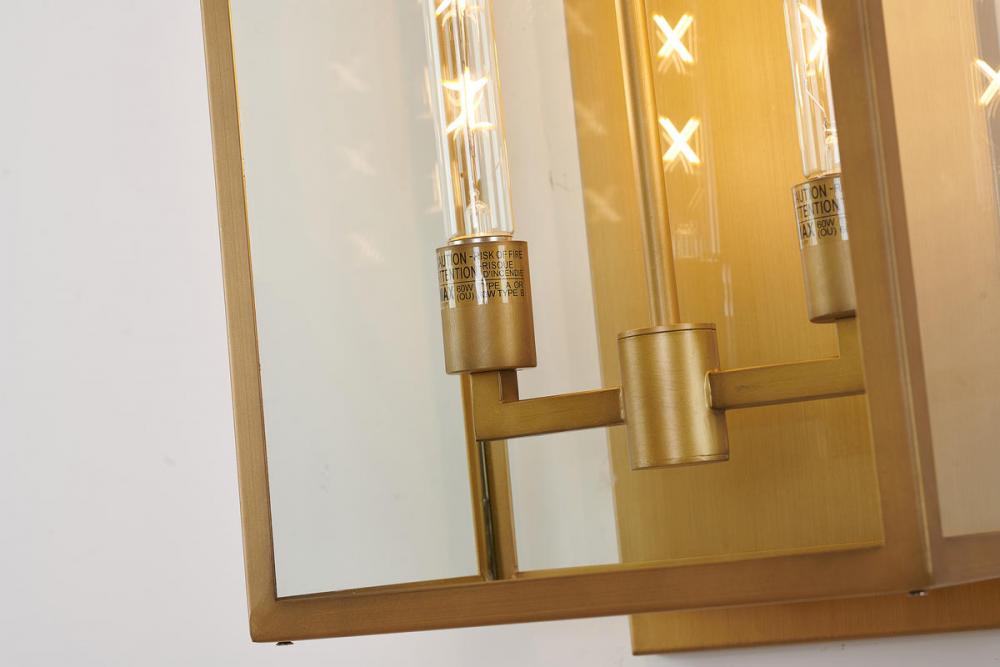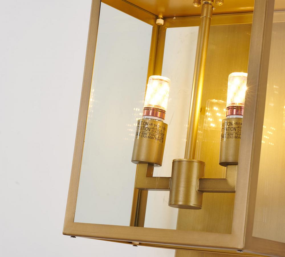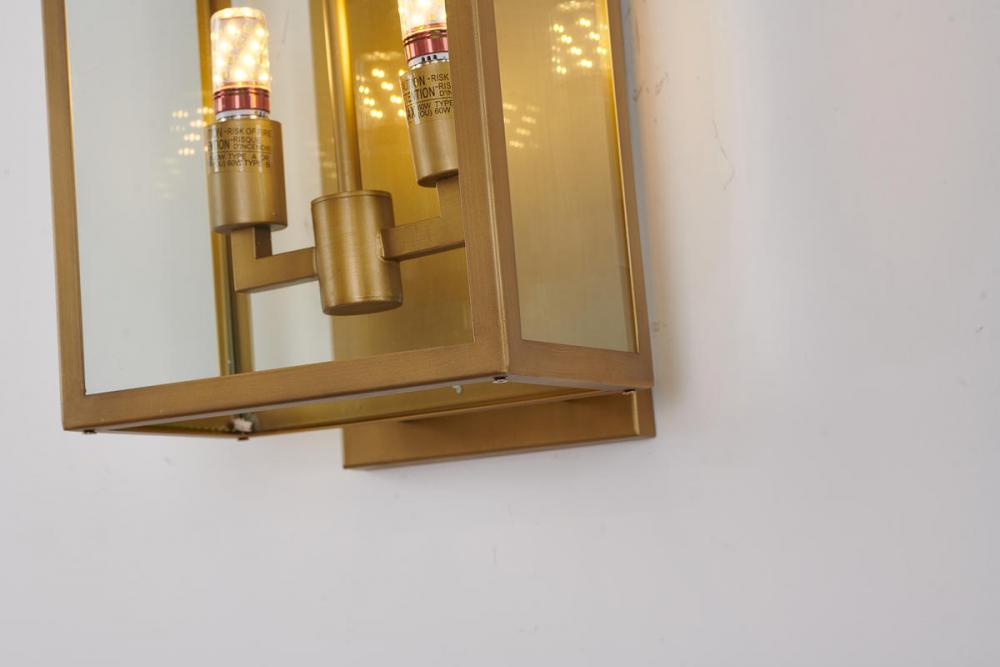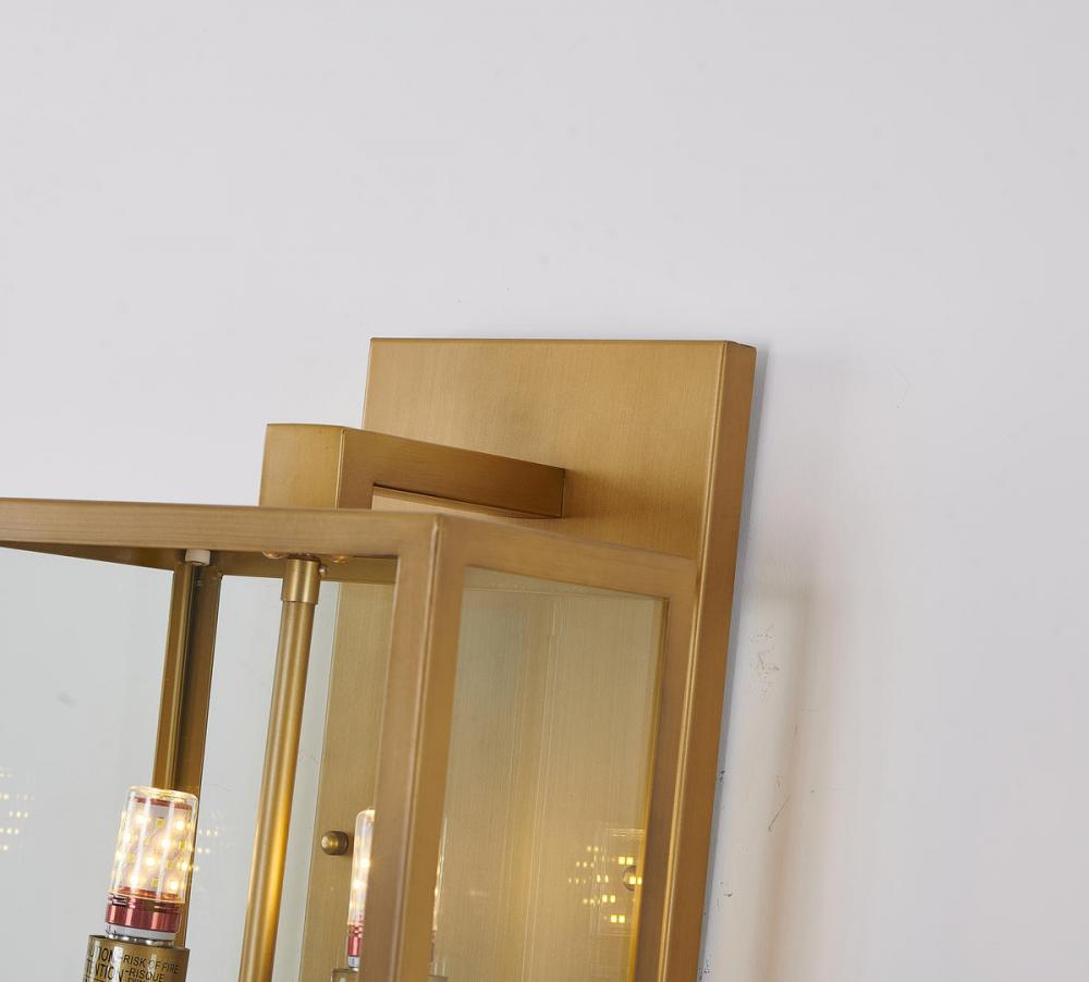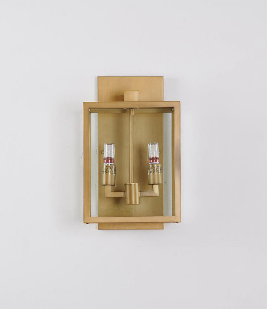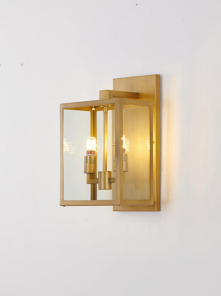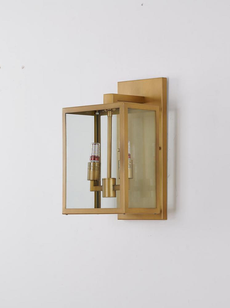 This exquisite outdoor wall sconce is in a gold finish. The frame is made out of stainless steel, and it comes with a clear glass shade. Two E12 bulbs (sold separately) can provide enough illumination.