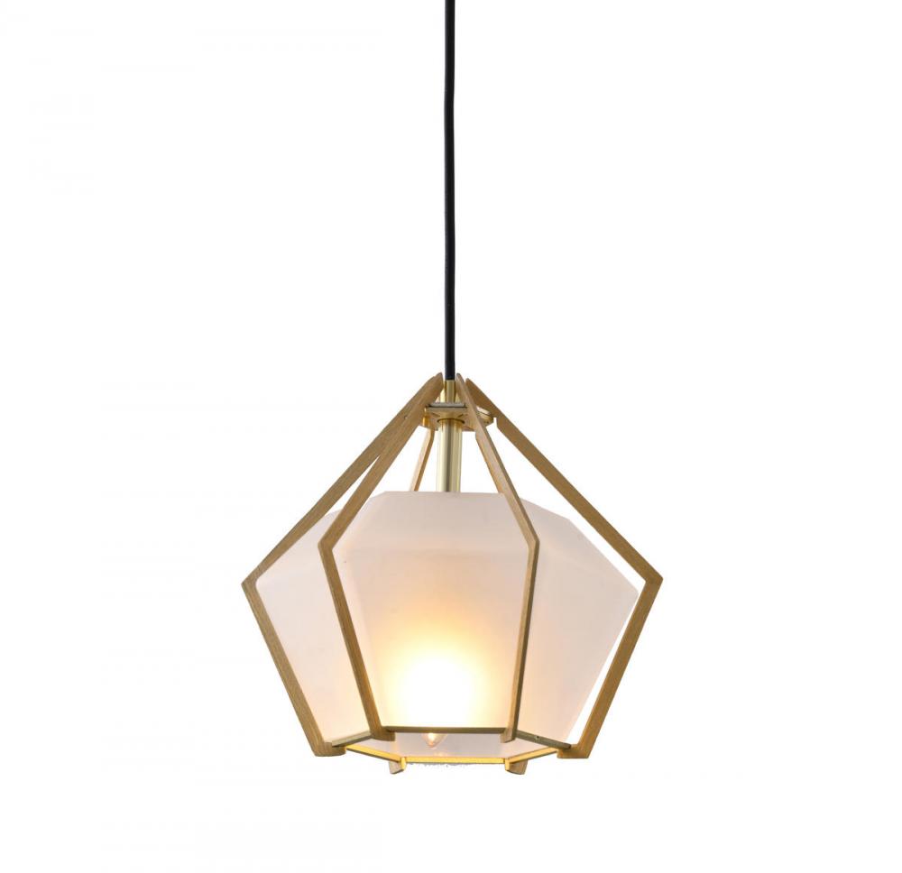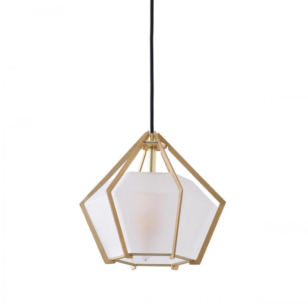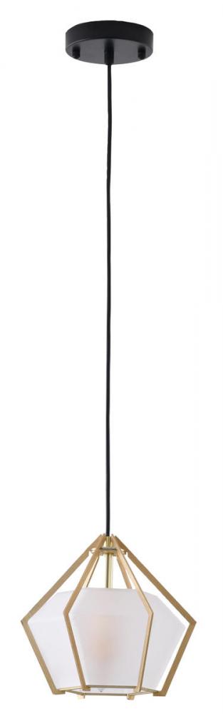 This pendant is in a gold finish. The frame is made out of aluminum, and it comes with a frosted glass shade. The adjustable cord link makes this fixture suitable for most ceiling heights.