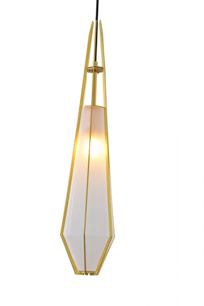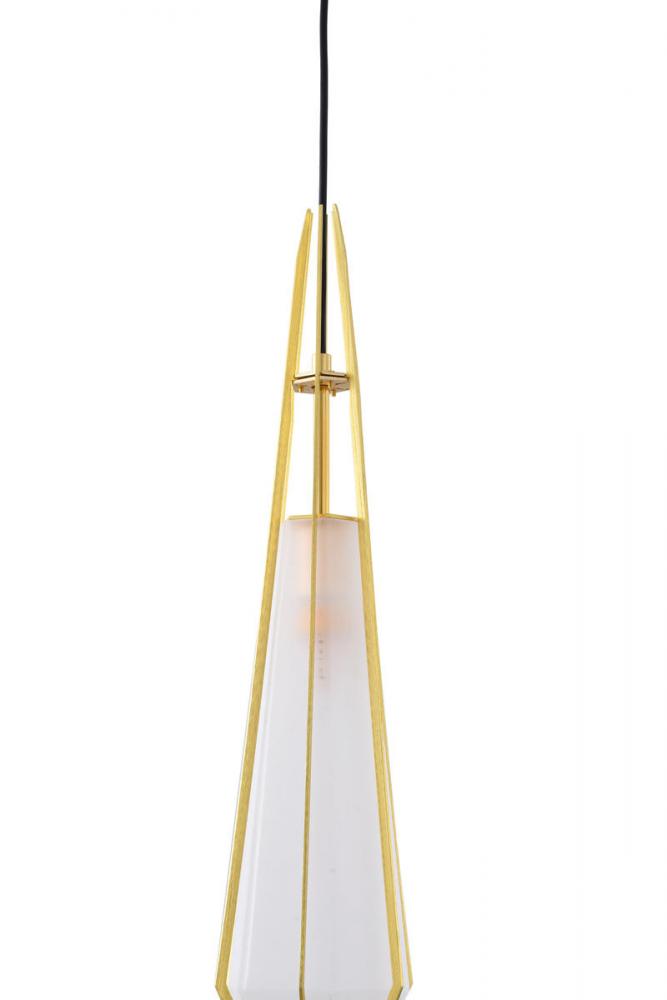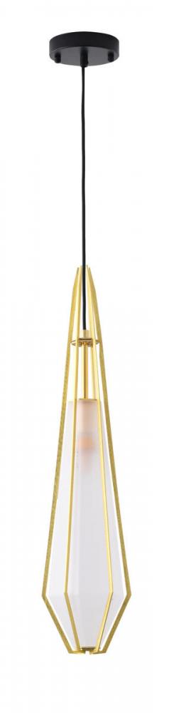 This pendant is in a gold finish. The frame is made out of aluminum, and it comes with a frosted glass shade. The adjustable cord link makes this fixture suitable for most ceiling heights.