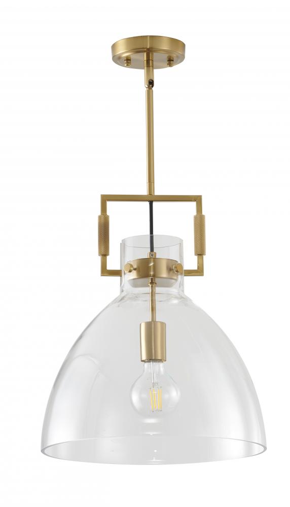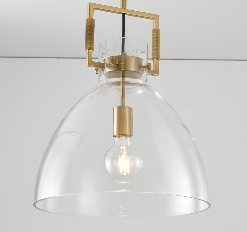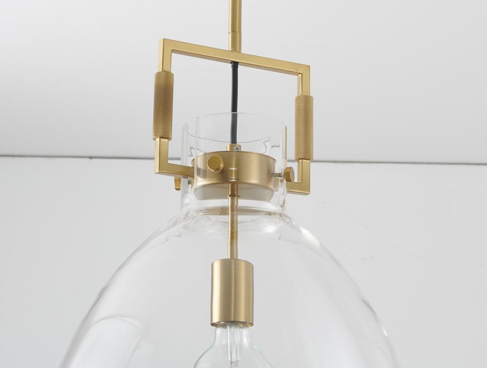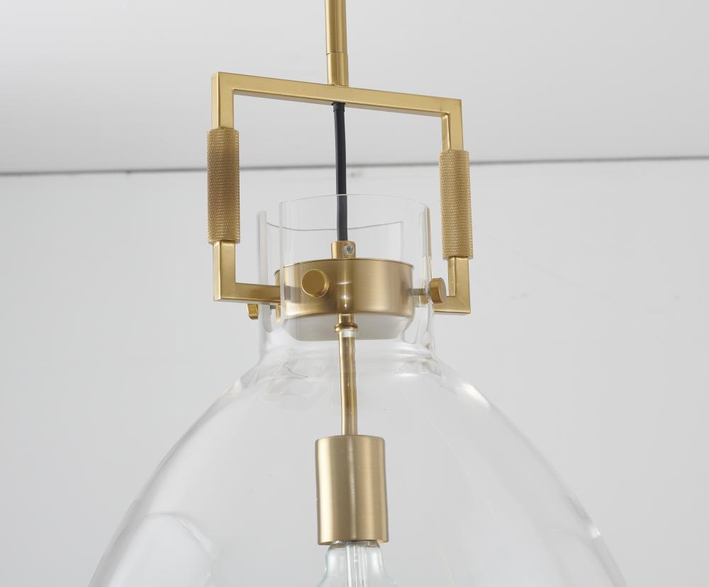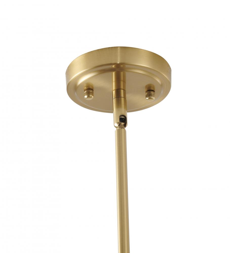 This pendant is in a gold finish. It comes with a clear glass shade. The rod length of 16" + 16" + 6" is provided and the rod length is adjustable.