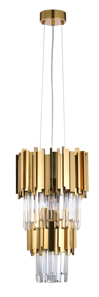 This exquisite two tier pendant fixture is in a gold finish. The frame is made out of stainless steel, and it comes with clear crystal accents. The adjustable cord link makes this fixture suitable for most ceiling heights.