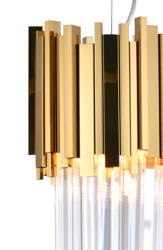 This exquisite pendant fixture is in a gold finish. The frame is made out of stainless steel, and it comes with clear crystal accents. The adjustable cord link makes this fixture suitable for most ceiling heights.