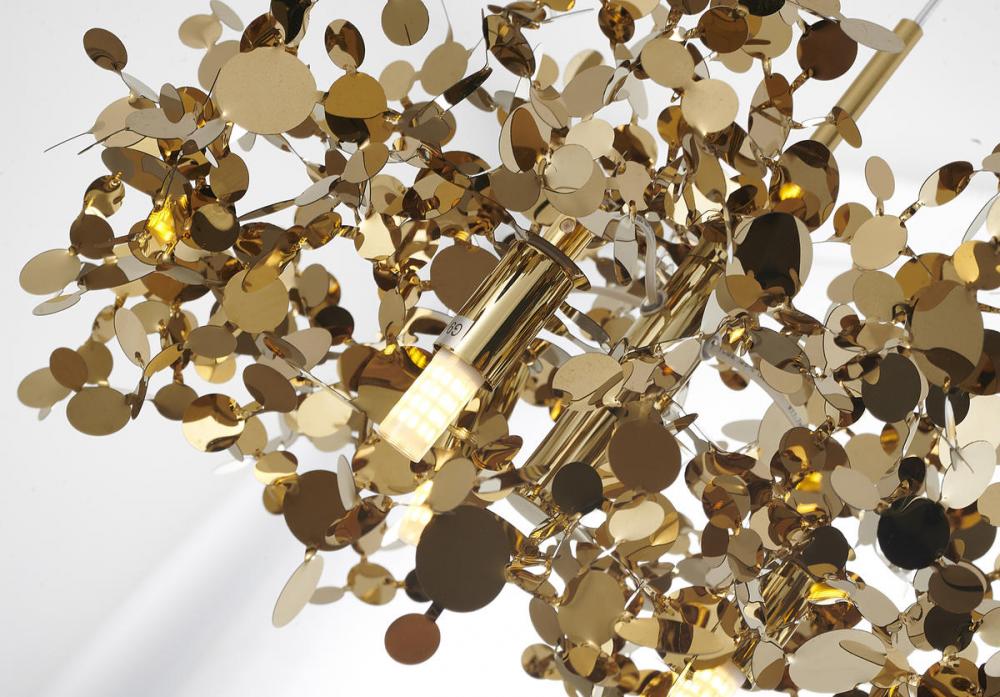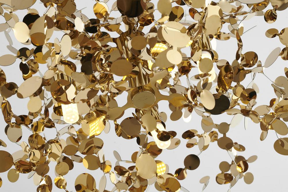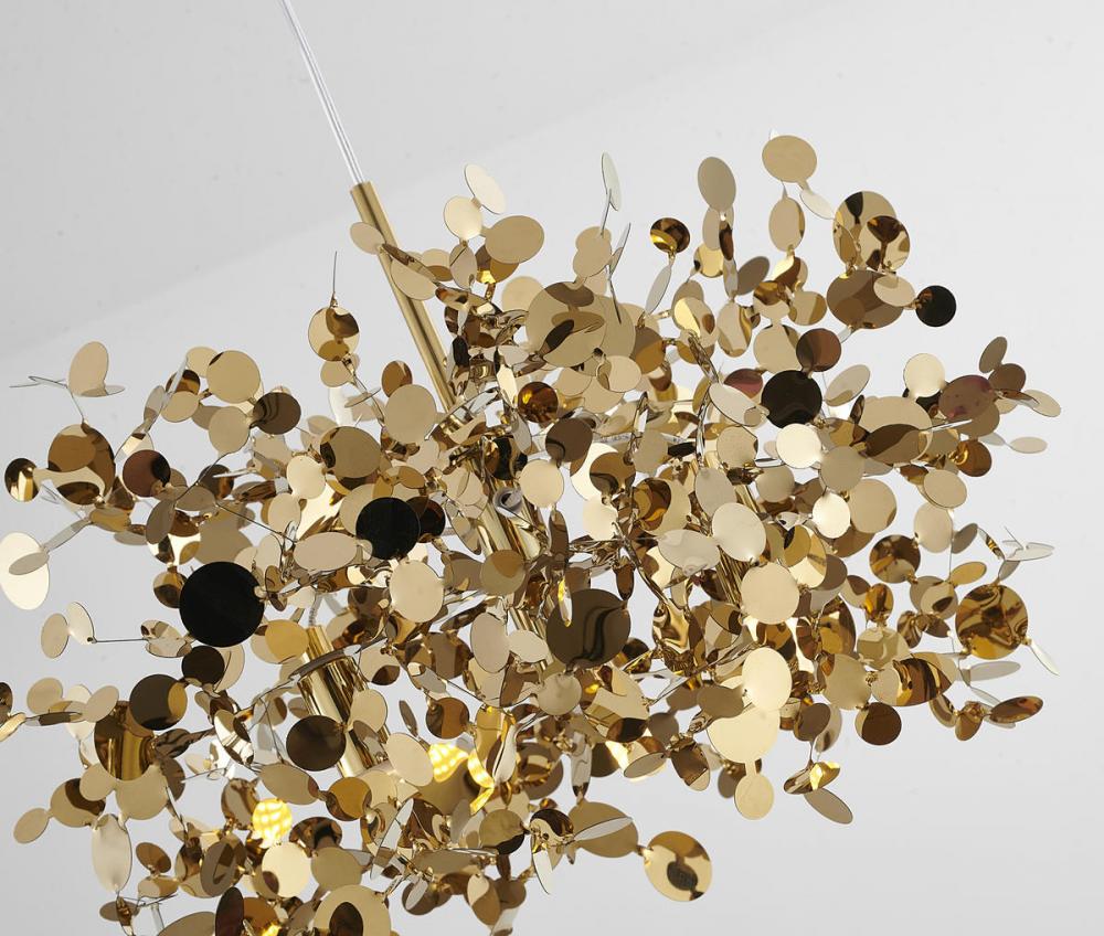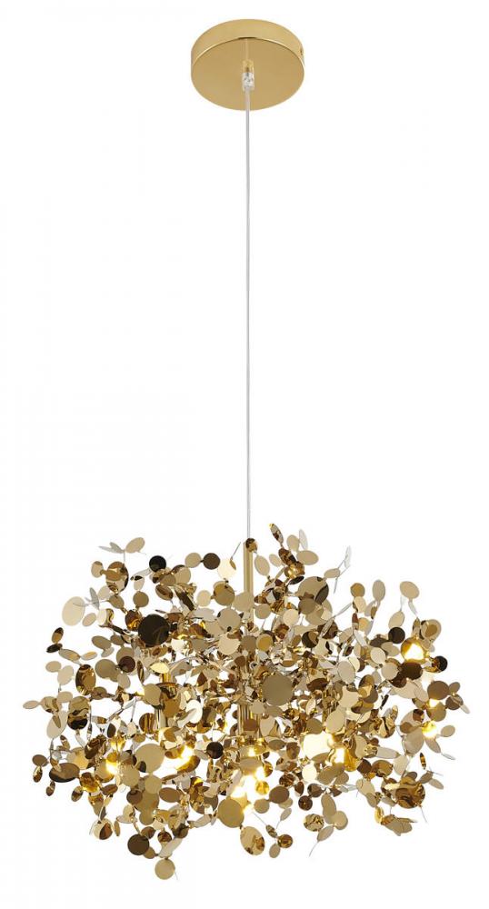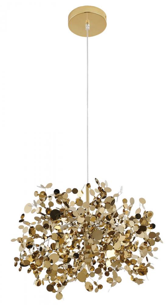 This exquisite pendant is in a gold finish. The frame is made out of stainless steel, and it comes with gold metal sparkle confetti. The adjustable cord link makes this fixture suitable for most ceiling heights.
