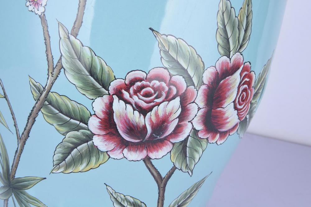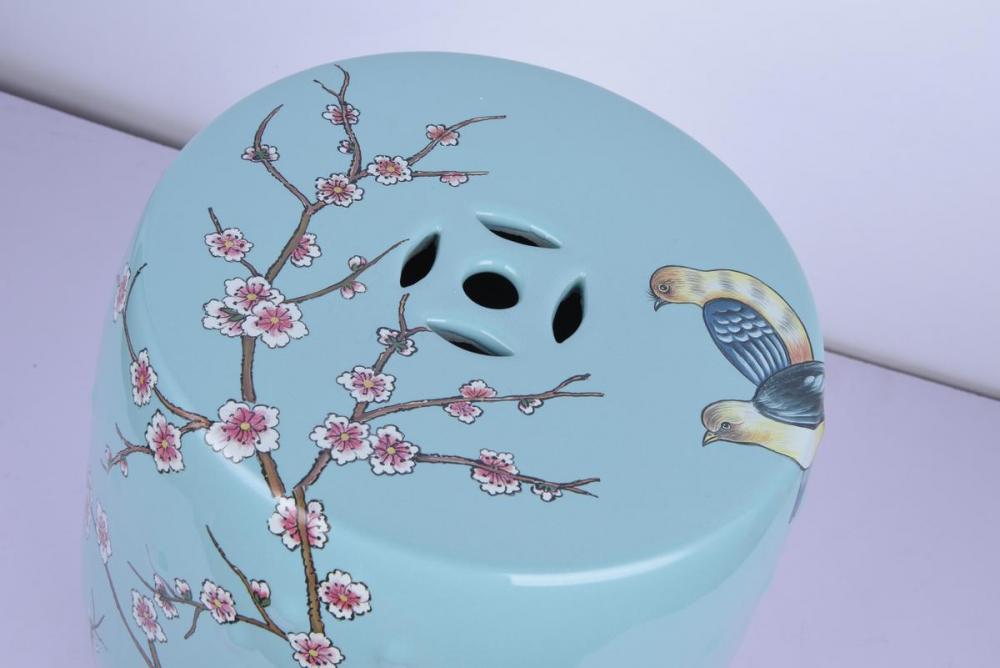 This beautiful sitting stool is in a blue finish. It comes with hand painted cherry blossom with multi-color. It can be used in any rooms.