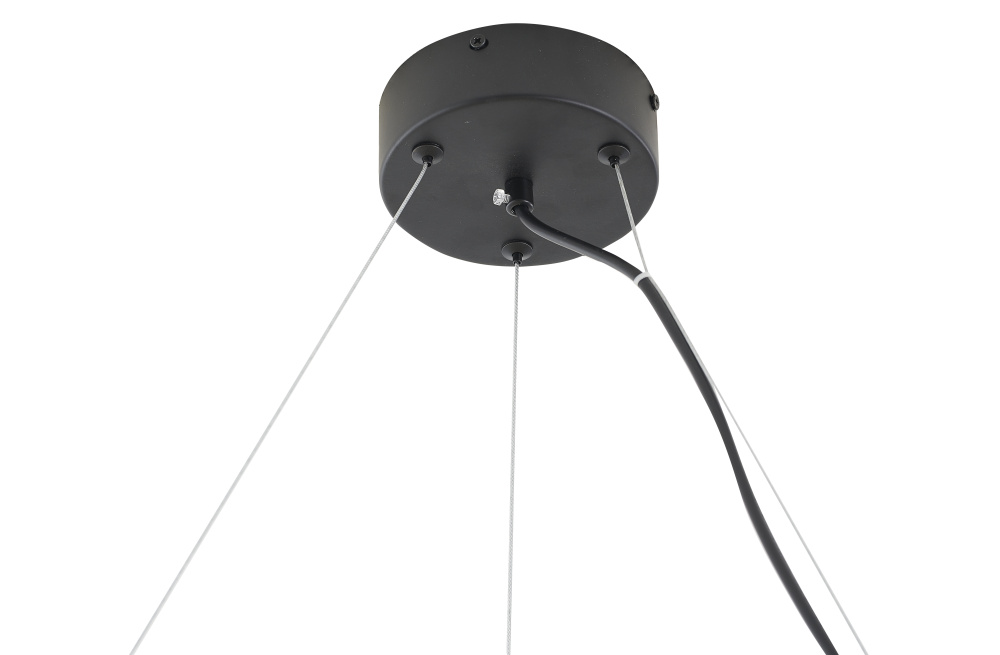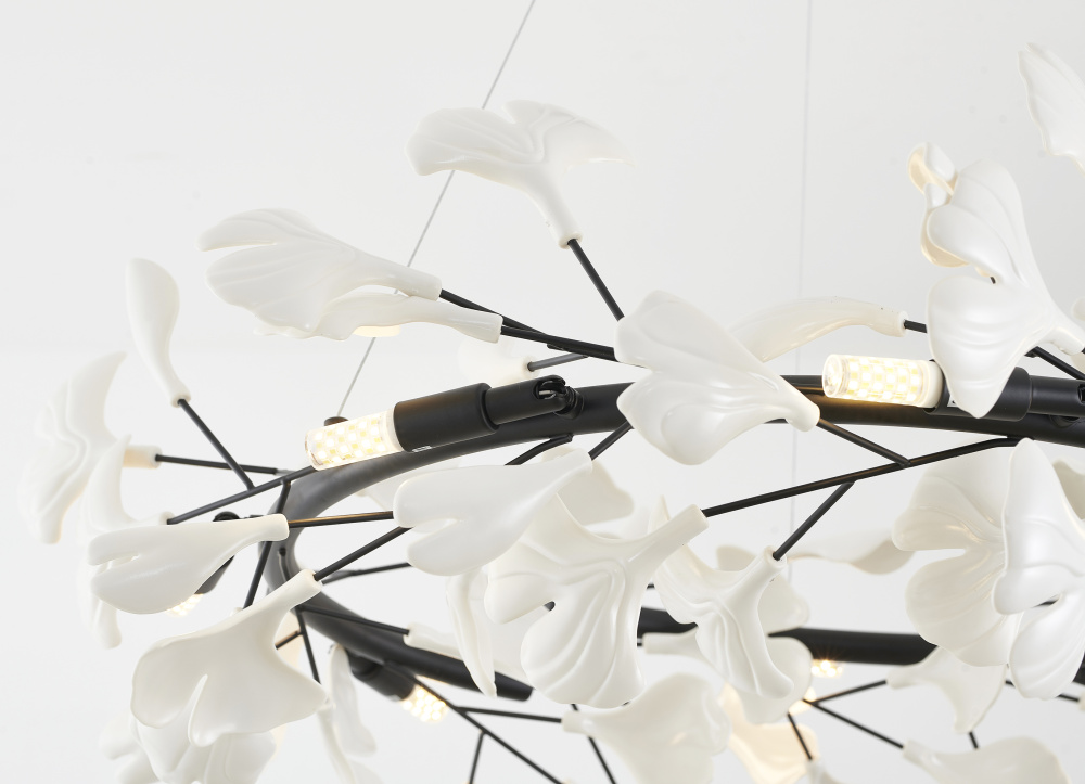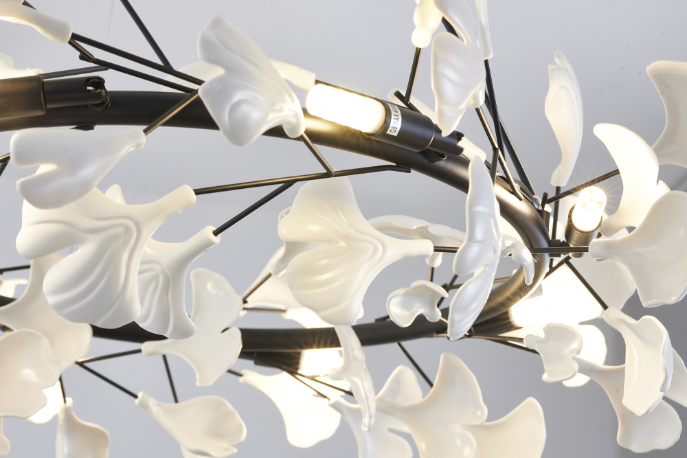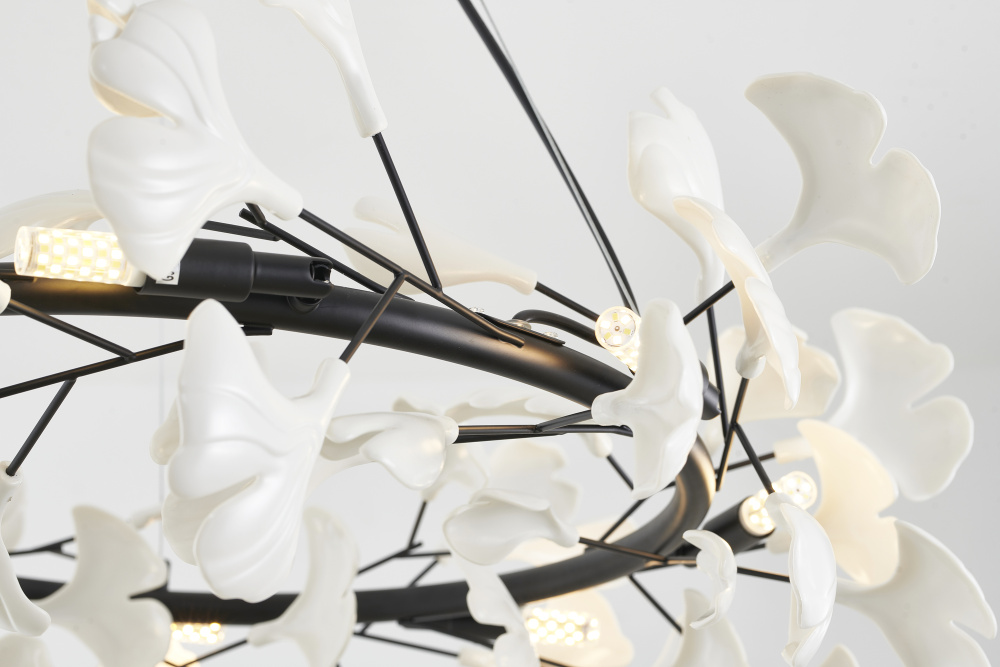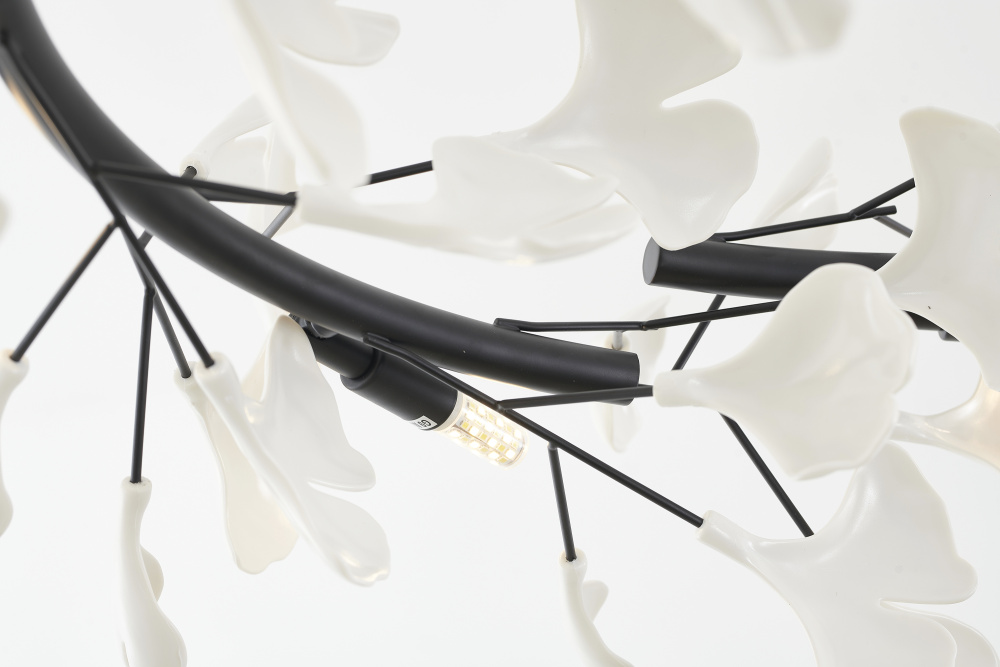 This chandelier is a round black frame chandelier. It comes with matte white leaf petals. The cord length of 71 inches is provided and the cord length is adjustable.