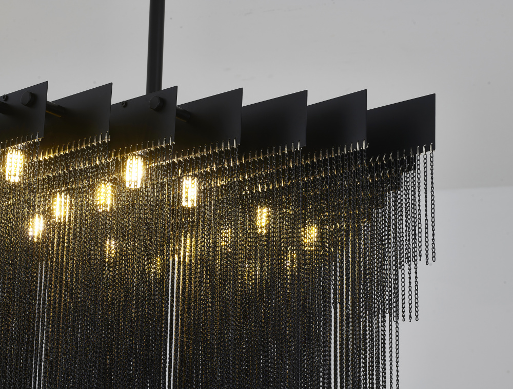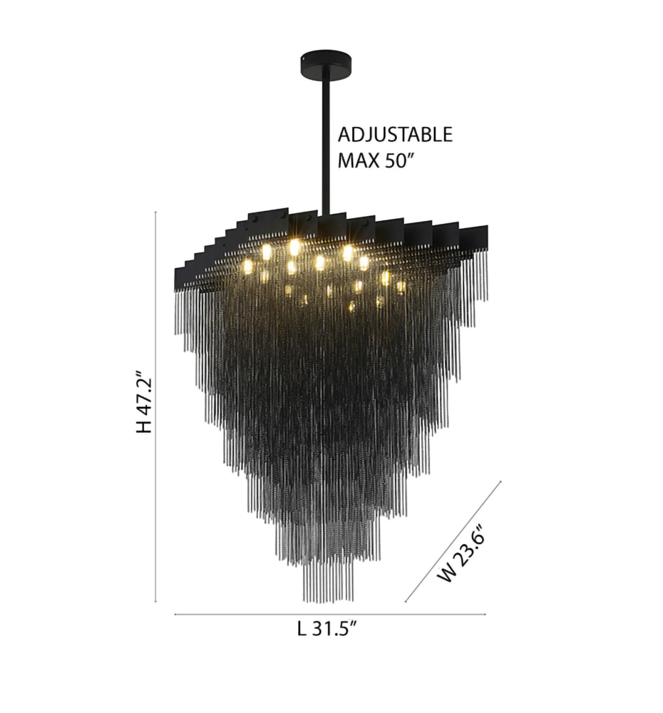 This transitional chandelier is a lighting fixture that measures 31.5 inches in length, 23.6 inches in width, and 47.2 inches in height. It features a satin black stainless steel frame with hanging aluminum chains and is designed to provide a warm and elegant ambiance. With 16xG9 base, this fixture is suitable for use with 40-watt bulbs (Bulbs Not Included). Its sleek and modern design makes it an excellent choice for living room, dinning room, or foyer. The adjustable rod link makes this fixture suitable for most ceiling heights