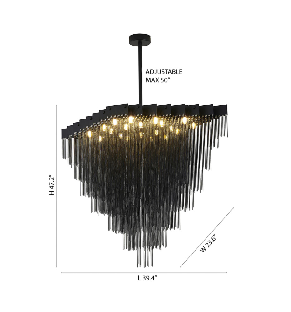 This transitional chandelier is a lighting fixture that measures 39.4 inches in length, 23.6 inches in width, and 47.2 inches in height. It features a satin black stainless steel frame with hanging aluminum chains and is designed to provide a warm and elegant ambiance. With 20xG9 base, this fixture is suitable for use with 40-watt bulbs (Bulbs Not Included). Its sleek and modern design makes it an excellent choice for living room, dinning room, or foyer. The adjustable rod link makes this fixture suitable for most ceiling heights