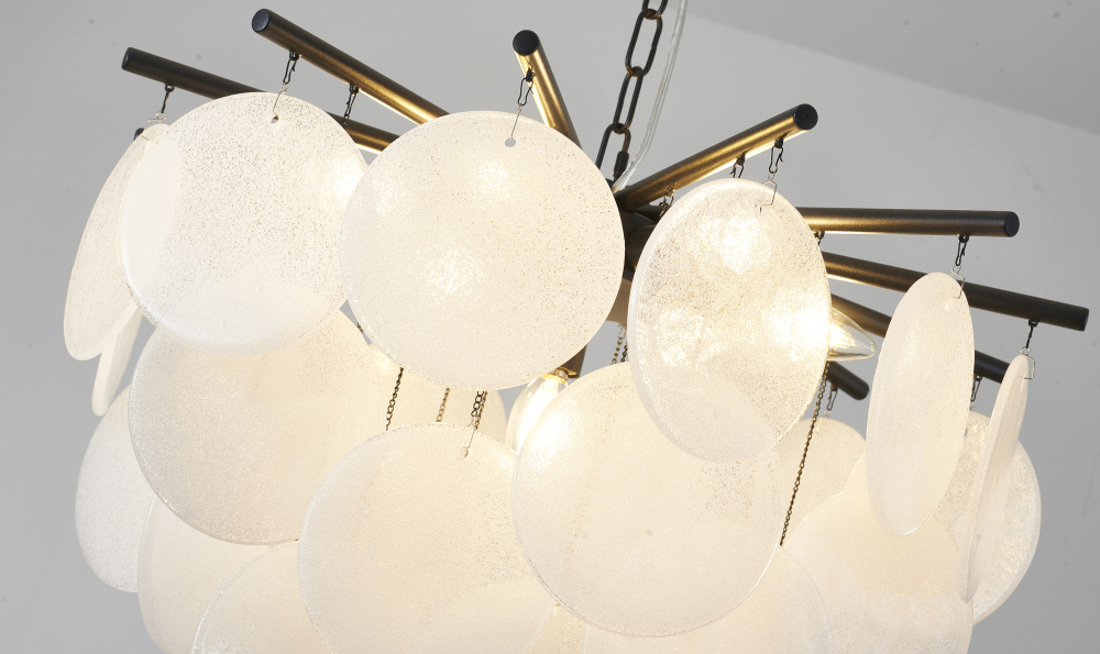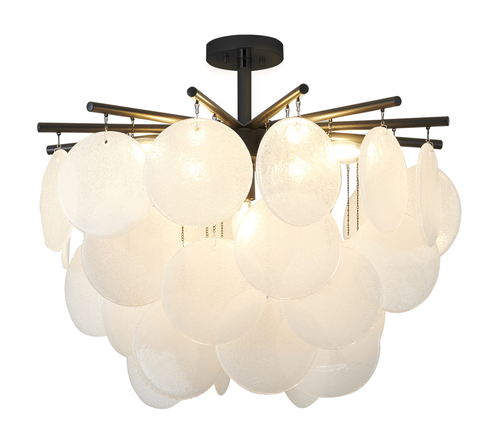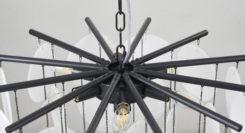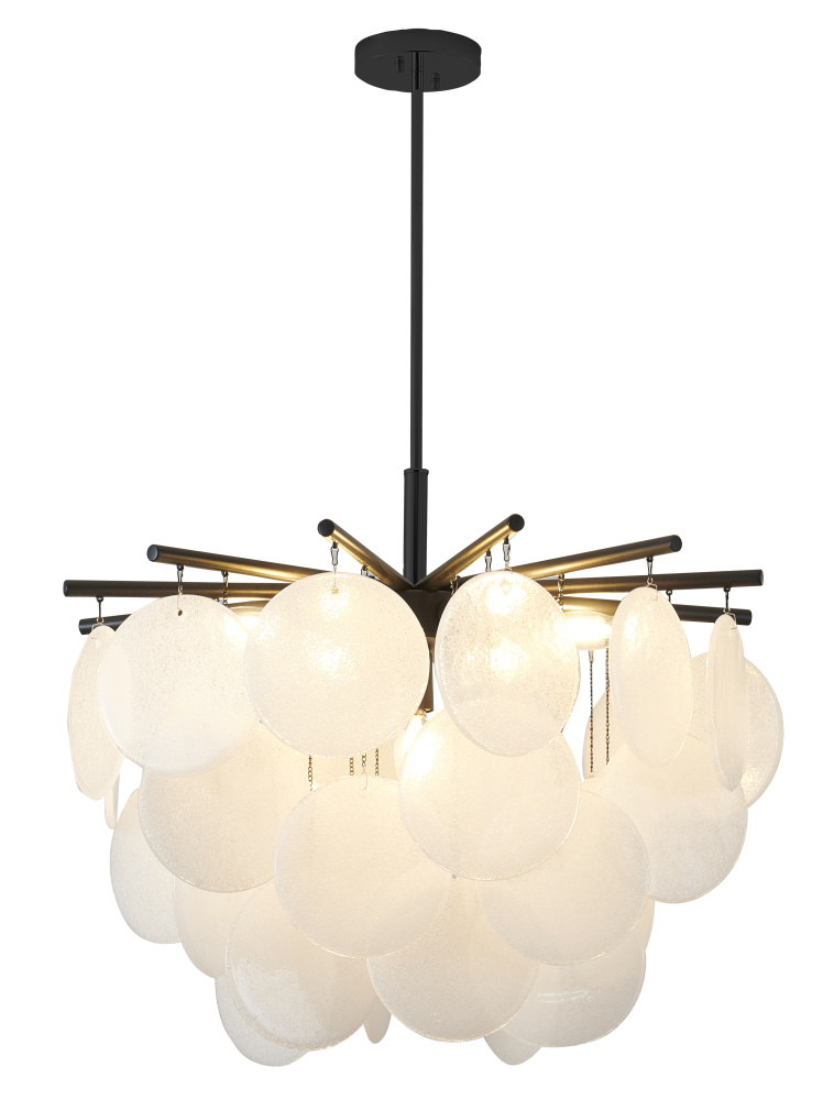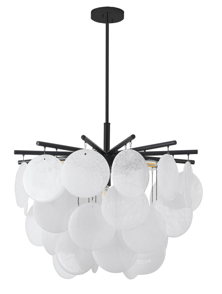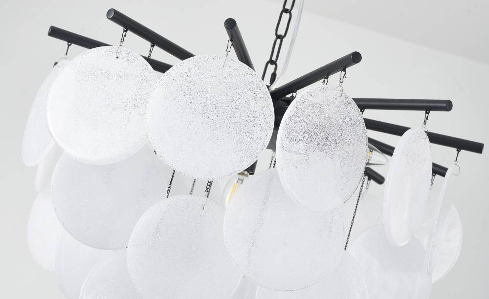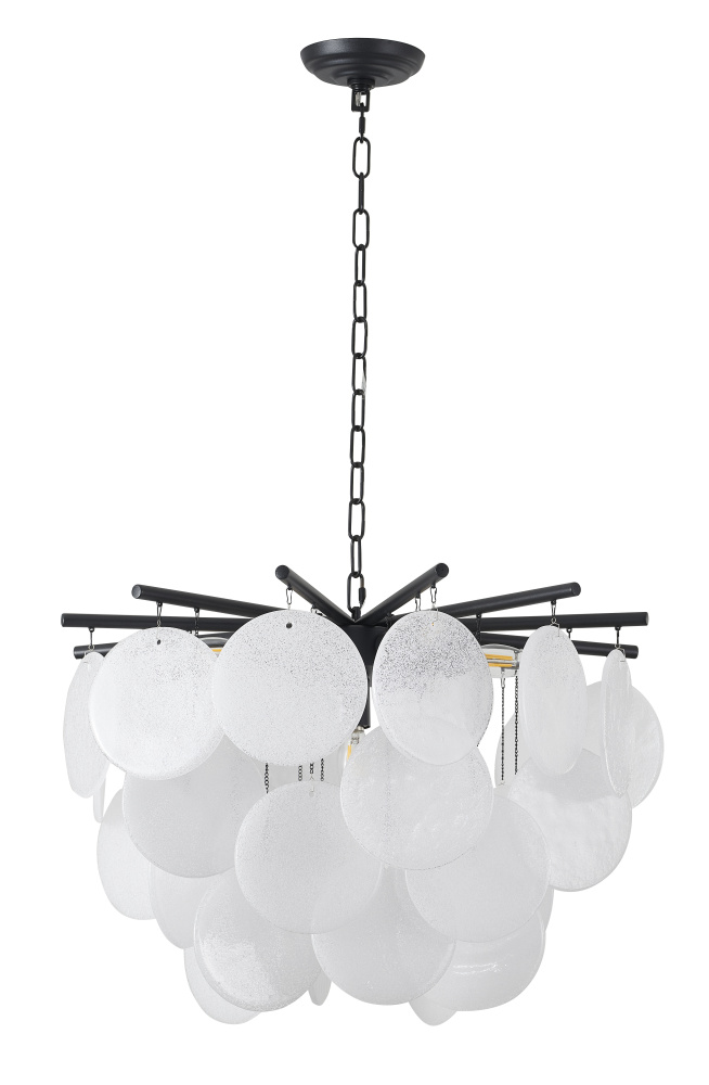 This chandelier is a satin black frame chandelier. It comes with frosted white hanging glass petals. The rod lengths of 16" + 16" + 12" + 6" is provided and the chain length of 60 inches is provided. Both chain lengths and rod lengths are adjustable.