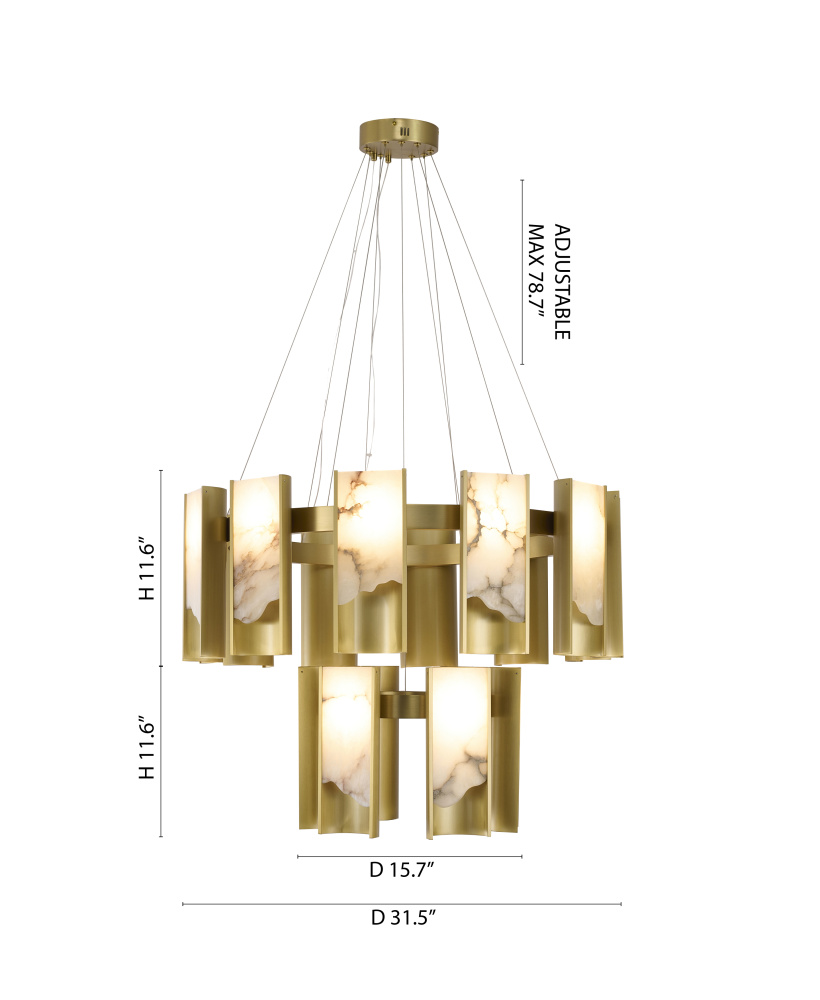 This two-tier 18-light transitional LED chandelier boasts a sophisticated and elegant design, featuring a stunning stain brass aluminum frame that adds a touch of luxury to any room. The fixture's unique two-tier design creates a sense of depth and visual interest, making it a great choice for high ceilings or large rooms. Measuring 31.5 inches in diameter and adjustable from 11.6 to 23.2 inches in height, this fixture is designed to be versatile and adaptable to a variety of spaces. The 18 LED lights provide a bright and even illumination, making it perfect for use in foyers, dining rooms, entryways, or living rooms.