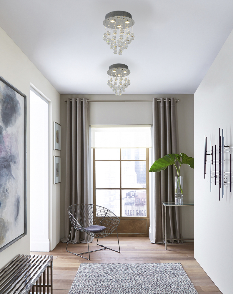 This semi flush mount is in a chrome finish. It comes with chrome hardware. The bulbs are not included and the height is not adjustable.