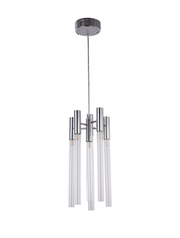 This modern single pendant light is in a chrome finish. The frame of this fixture is made out of metal. It comes with glass tubes in clear color. You can create a timeless feel in any room while using modern forms.