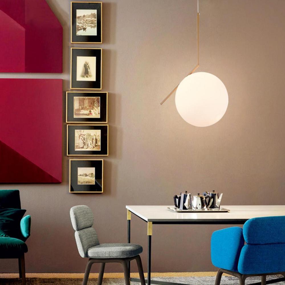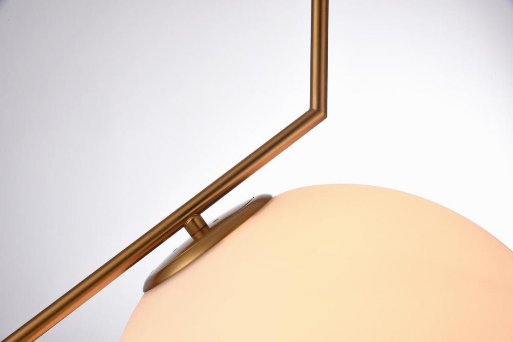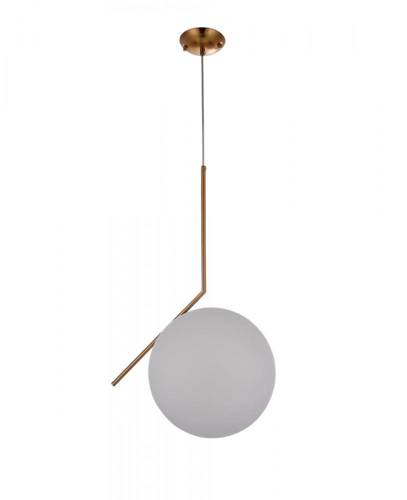 This single pendant light is in a gold finish with a milk white glass shade. The frame is made out of iron. The adjustable cord link makes this fixture suitable for most ceiling heights.
