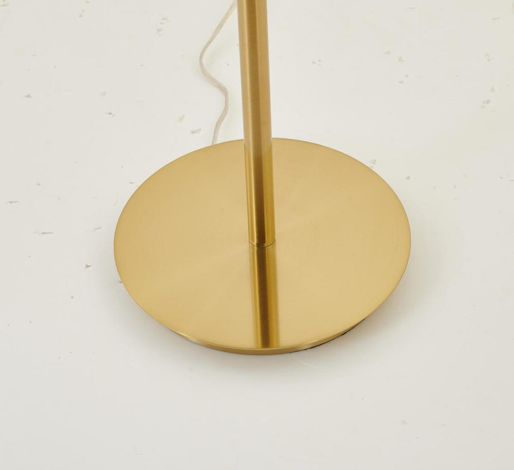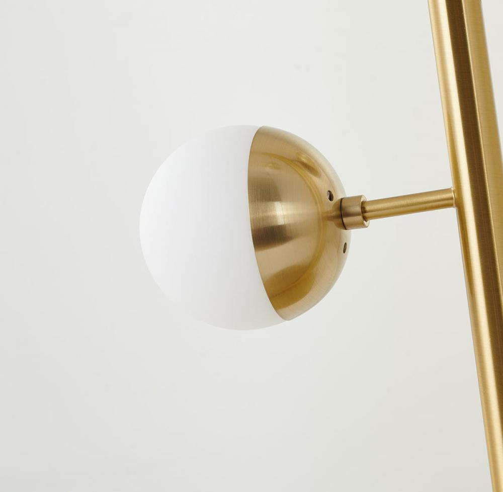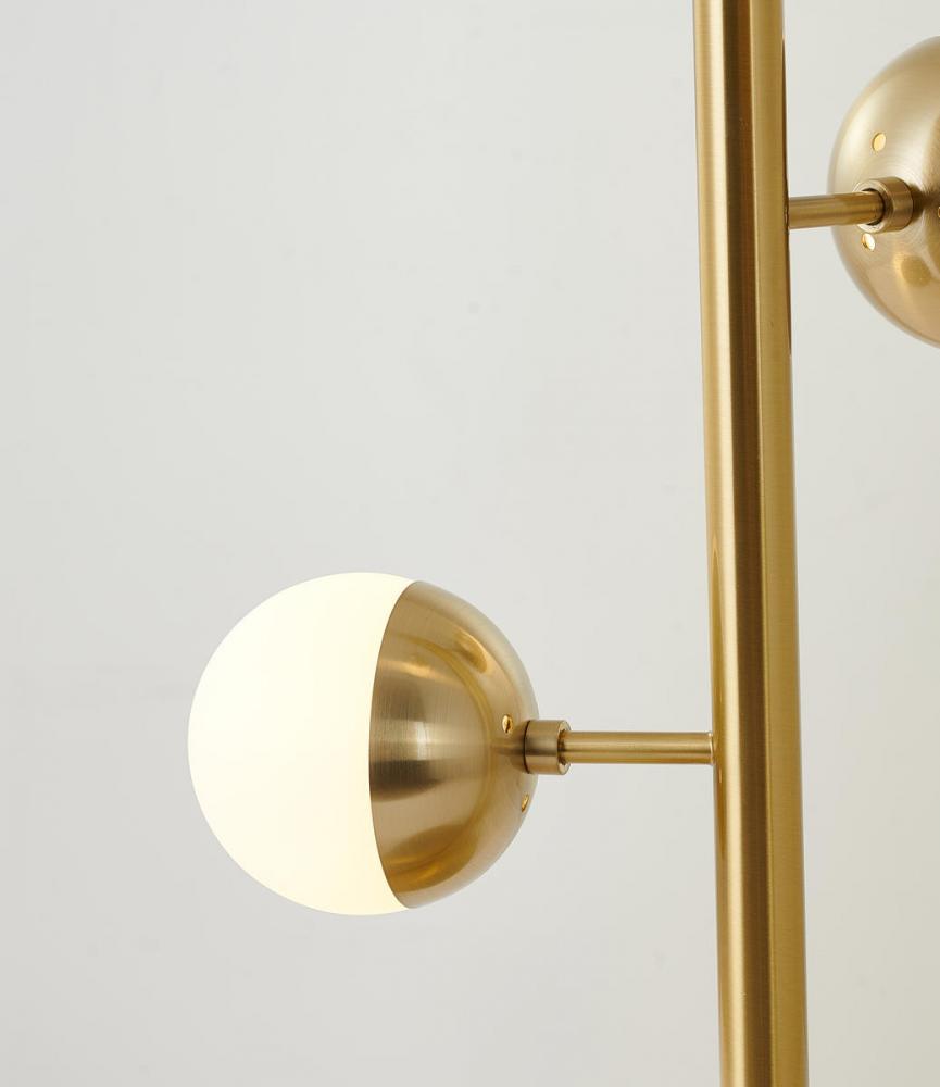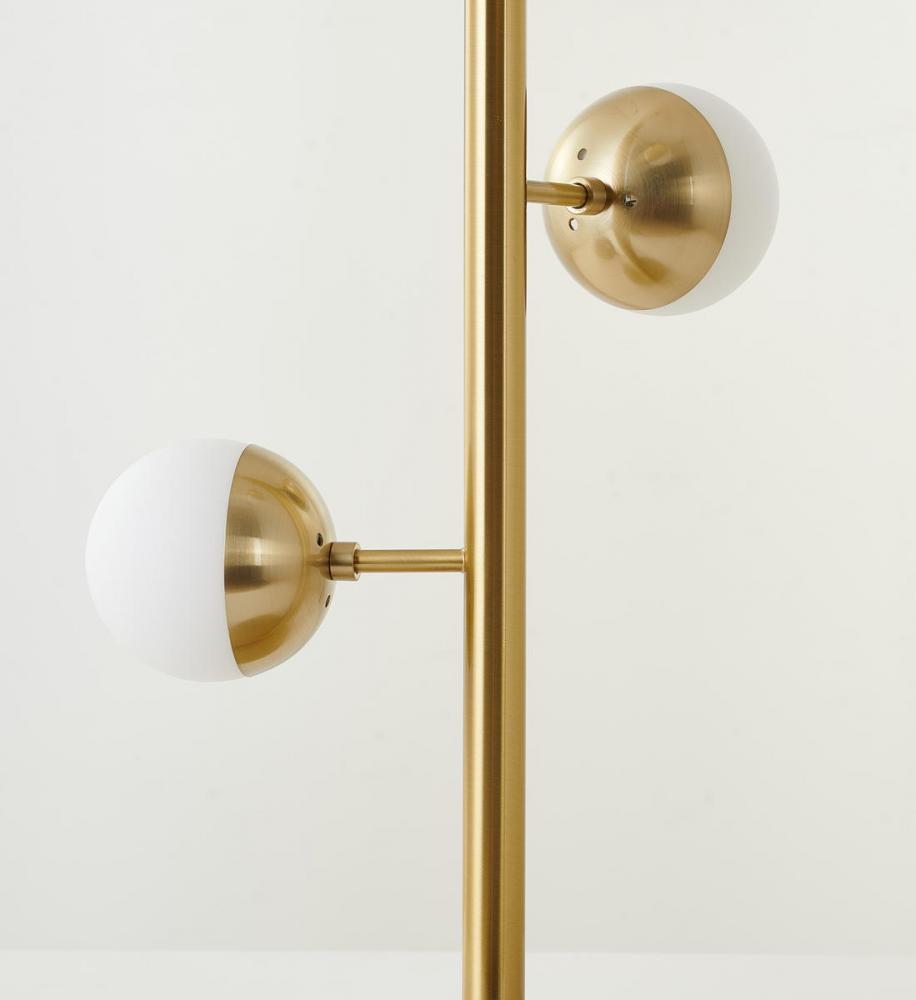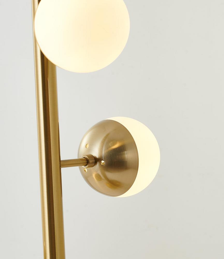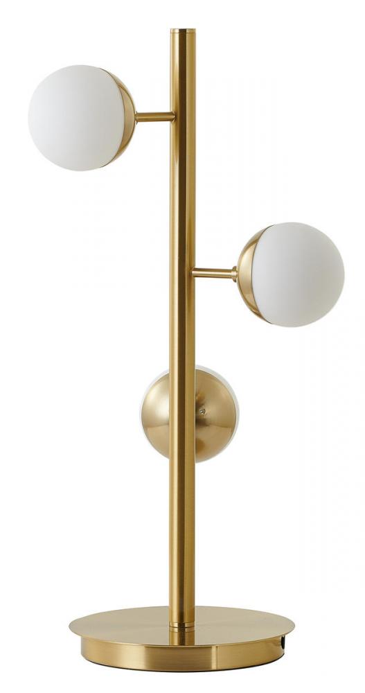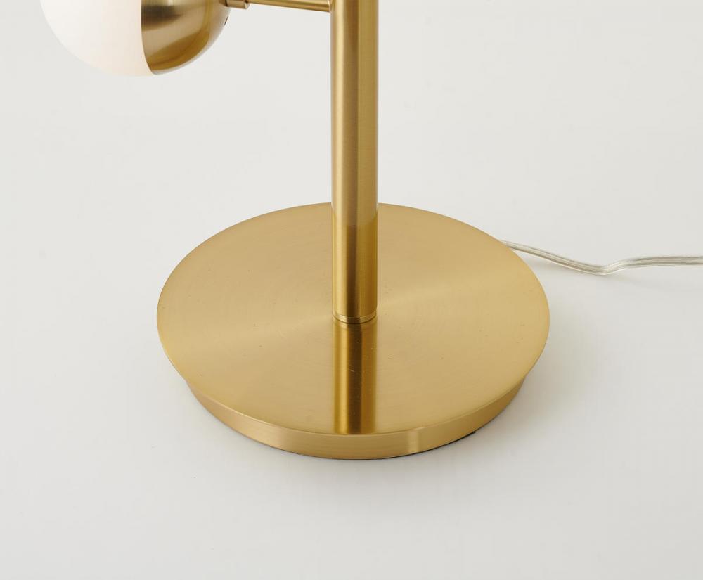This unique table lamp is in a brass finish. The frame is made out of metal, and it comes with white glass ball shades. It also has a plug in switch with ON/OFF button. It is great for chair side reading or general room illumination.