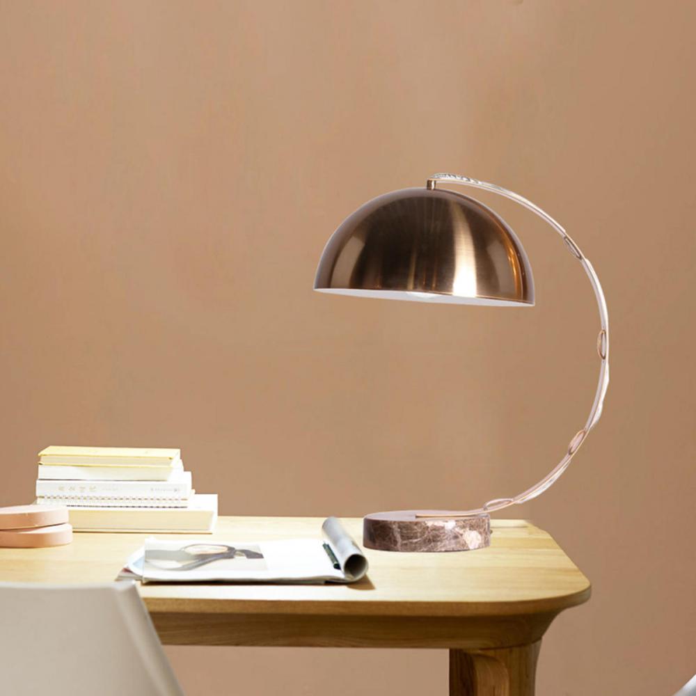 This modern table lamp is in a bronze gold finish. The frame is made out of metal, the base is made out of marble. It comes with a bronze gold metal shade. It is great for chair side reading or general room illumination.