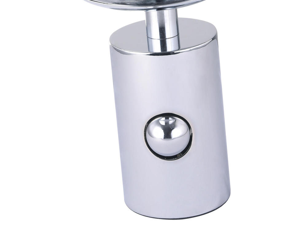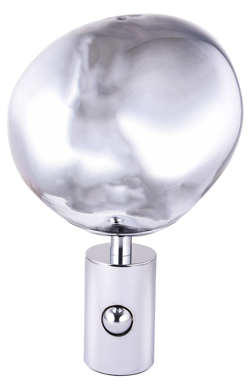 This exquisite table lamp is in a chrome finish. The frame is made out of metal, and it comes with an acrylic ORB shade in smoke color. This modern table lamp is great for chair side reading or general room illumination.
