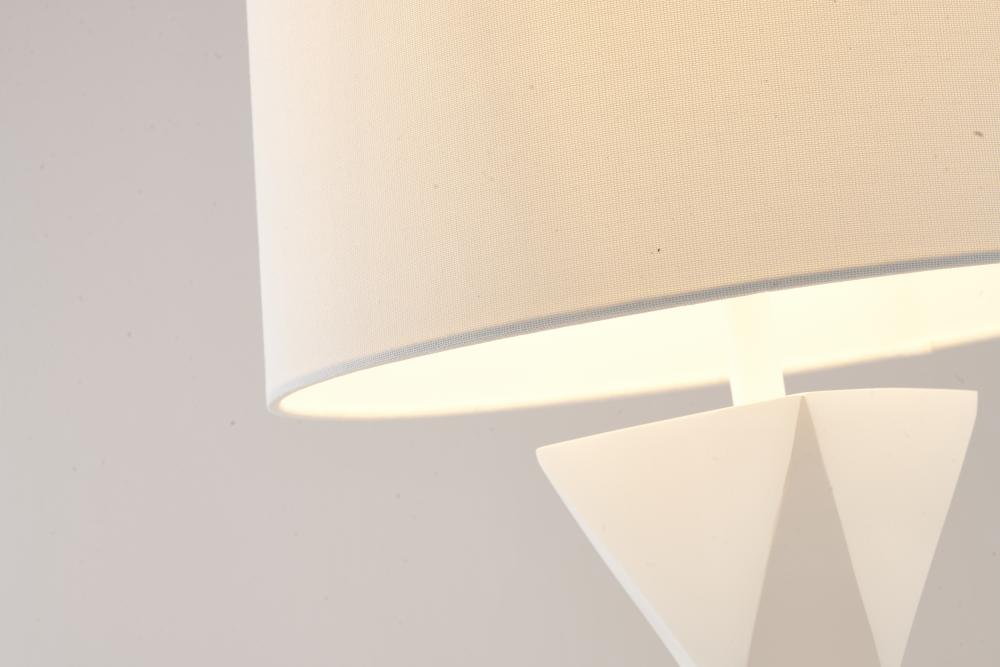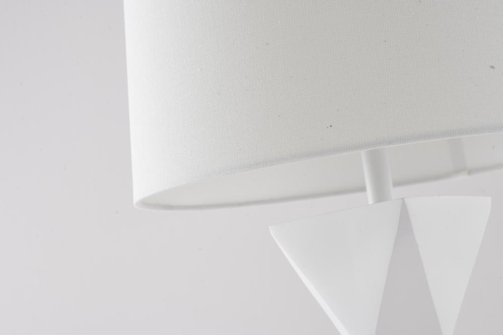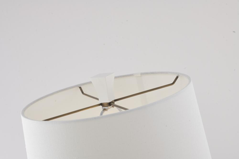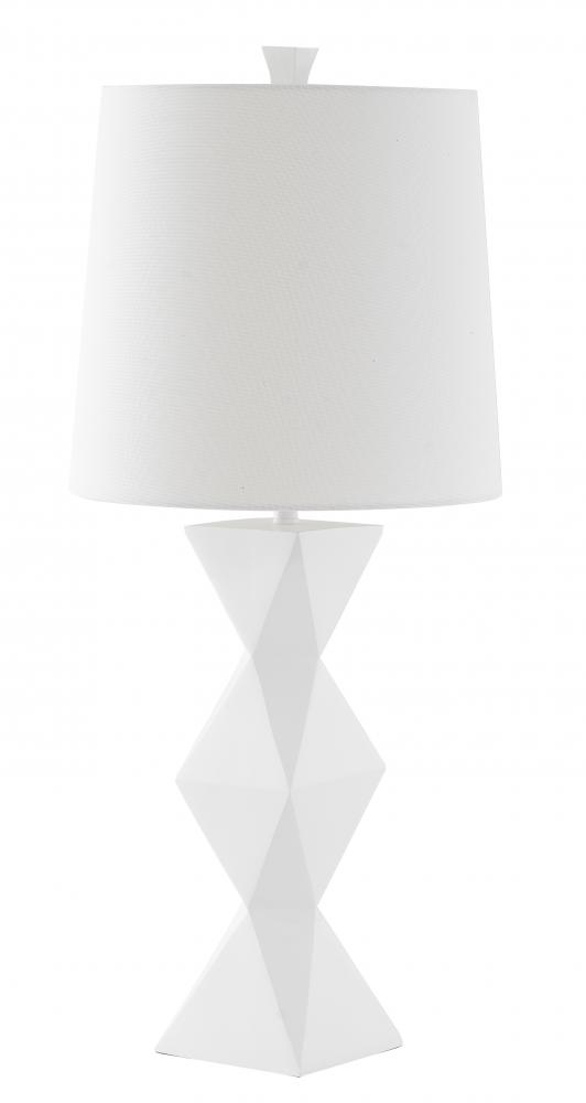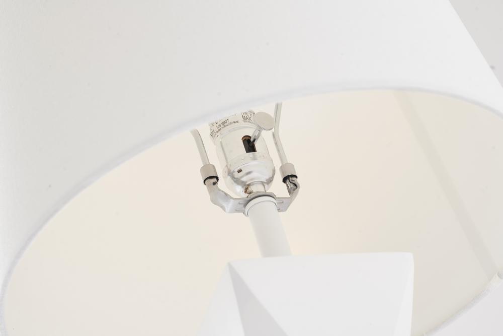 This table lamp is in a white finish. It comes with a white shade and chrome hardware. This table lamp has a three way switch. This table lamp comes with a plug in cord which is 72 inches long.