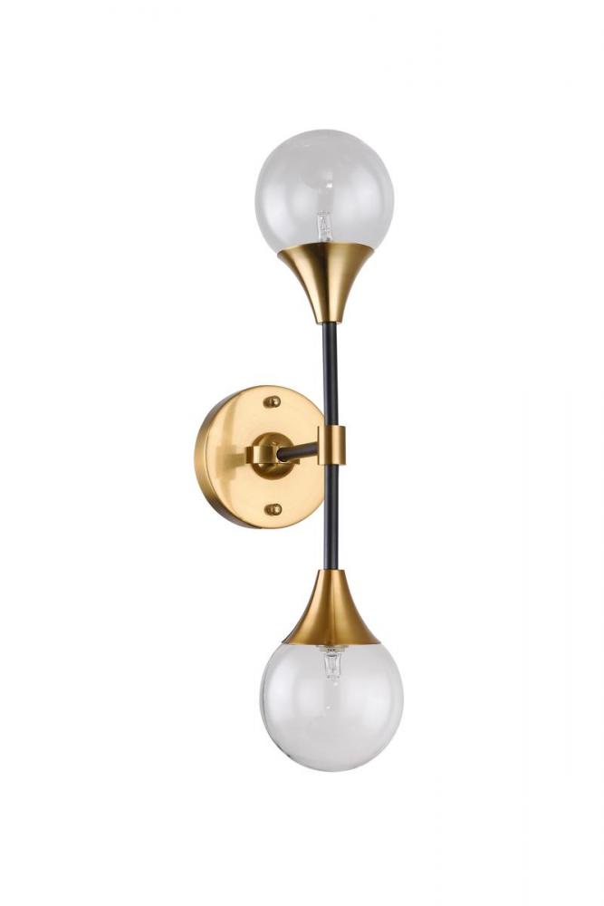 This modern wall sconce is in black and gold finish. The frame of this wall sconce is made out of metal. It comes with two glass globe shades in clear color. This modern wall sconce can be mounted horizontally or vertically. It can be used in any room, entryways, and more.