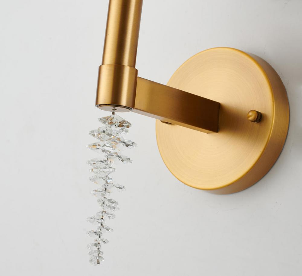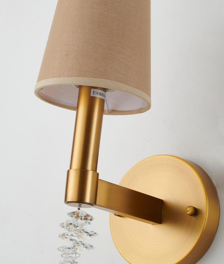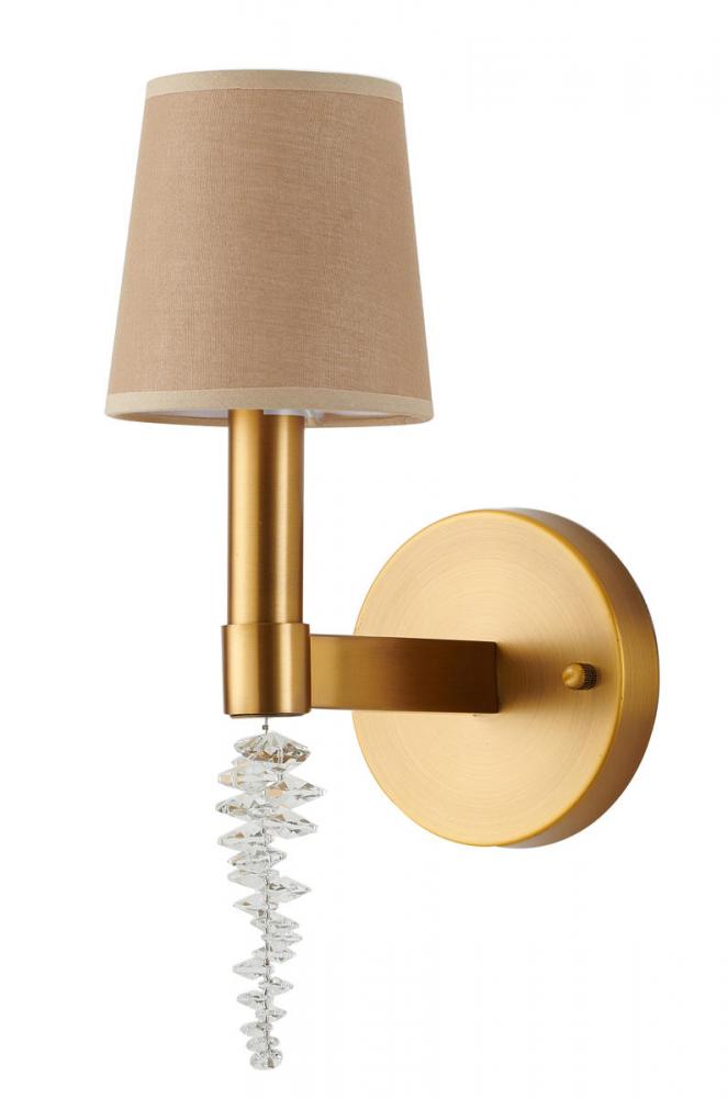 This wall sconce is in a brass finish. The frame is made out of iron, and it comes with clear hanging crystal accents. It also has a beige shade. This exquisite wall sconce can be used in modern vanities, hallways, and more.