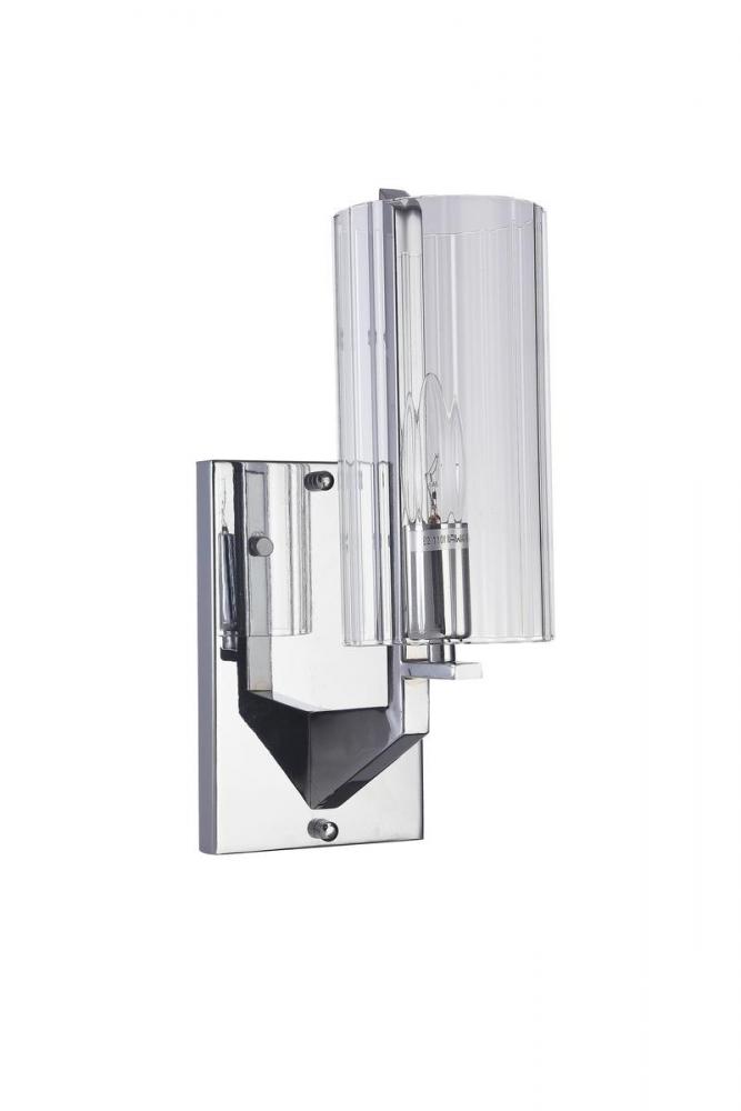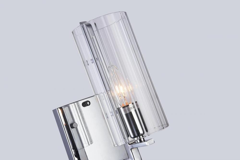 This modern wall sconce is in a chrome finish. The frame is made out of iron. It comes with a glass cylinder shade in clear color.