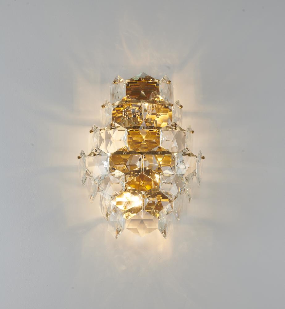 This wall sconce is a seven tier gold stainless steel frame wall sconce. It comes with clear hanging crystals. The materials for this wall sconce consists of stainless steel and crystal.