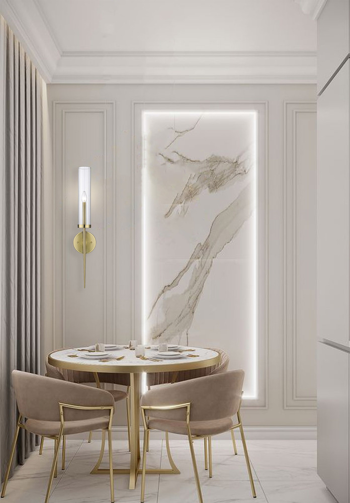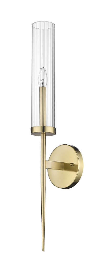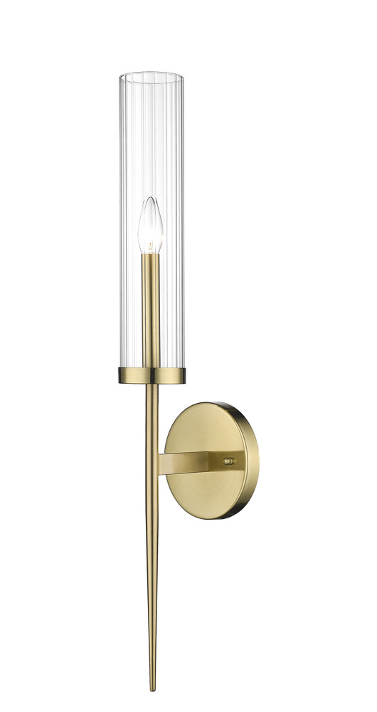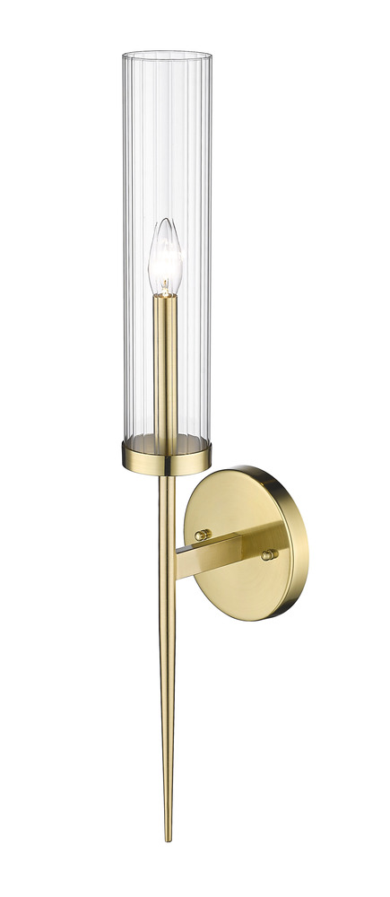 This exquisite wall sconce is in a gold finish. The frame is made out of metal, and it comes with a clear glass shade. It can be used in any rooms, entryways, and more.