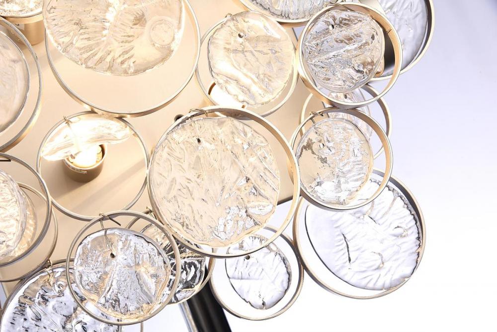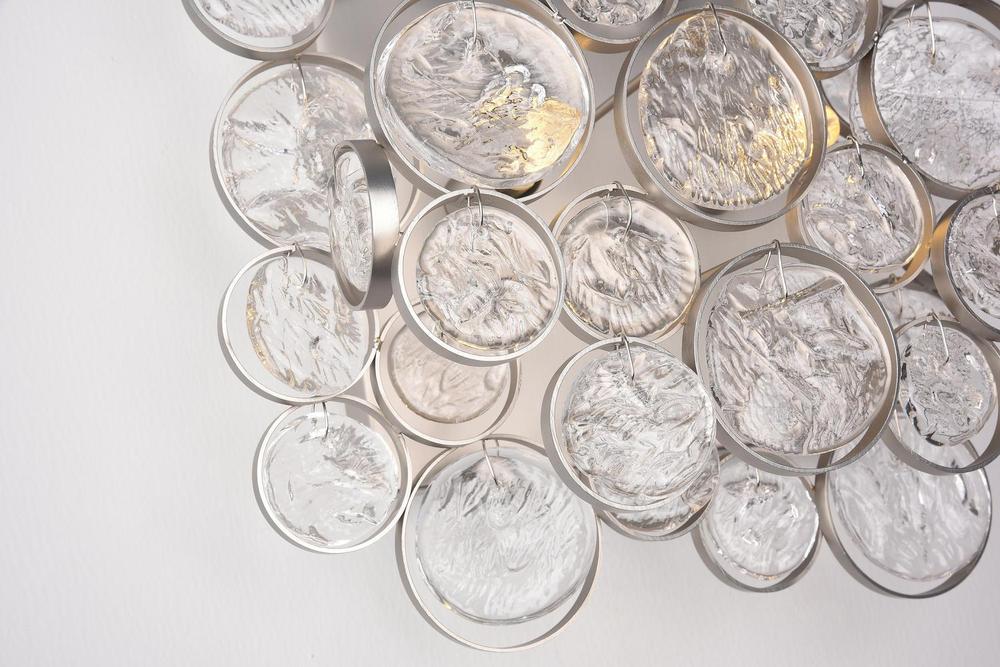This wall sconce has a beautiful matte nickel metal frame. It comes with rippled glass drops in clear color. This modern wall sconce can be mounted horizontally or vertically, and it can be used in modern vanities, hallways, and more.