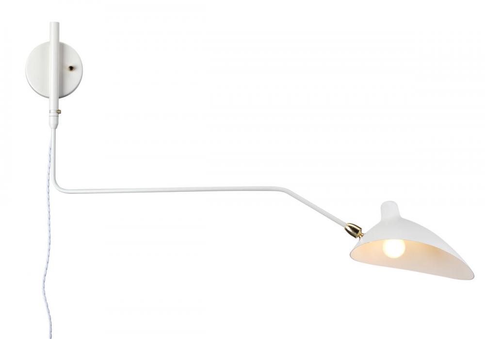 This unique wall sconce is in a matte white finish. The frame is made out of metal, and it comes with a white metal shade, an moveable arm, and a plugin switch with ON/OFF button.