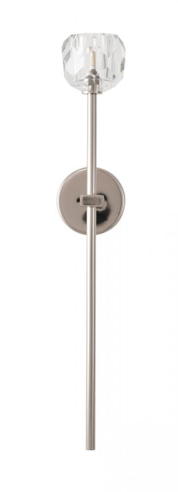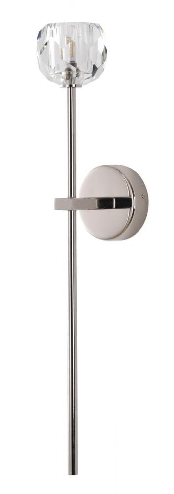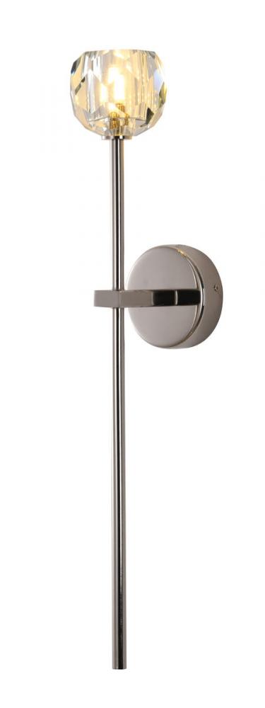 This wall sconce is in a polished nickel finish. The frame is made out of metal, and it comes with a clear crystal shade. It can be used in any rooms, entryways, and more.
