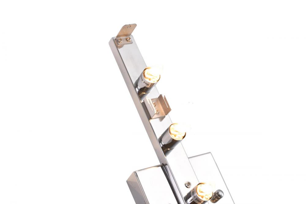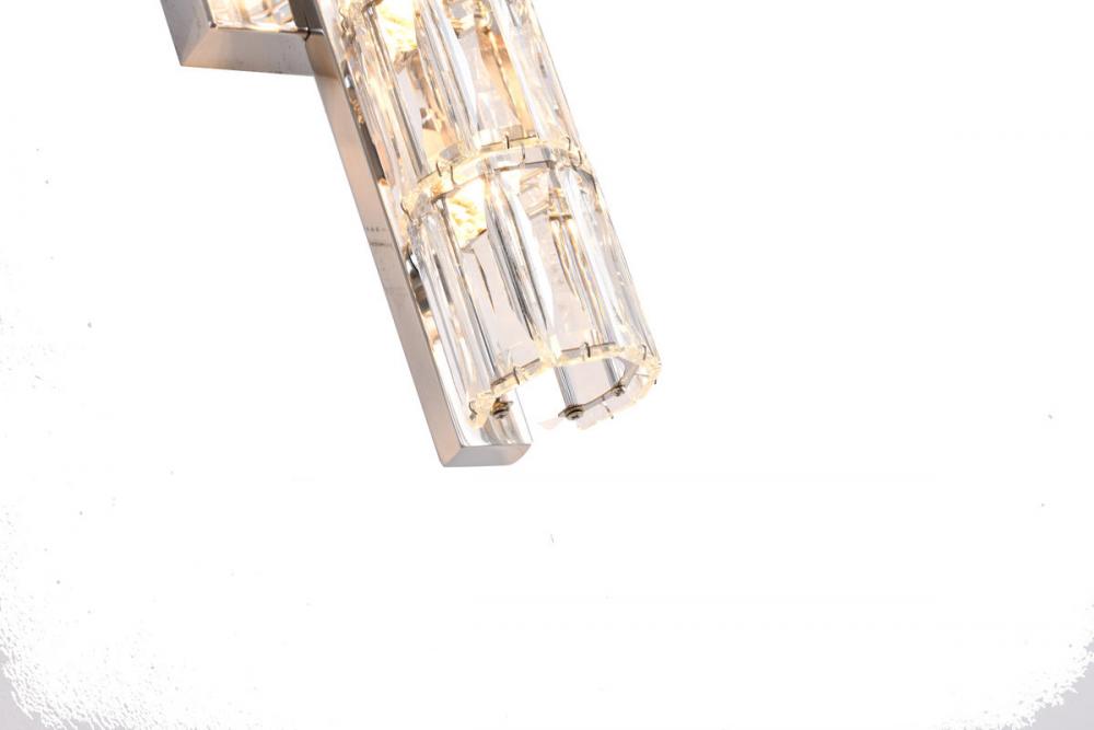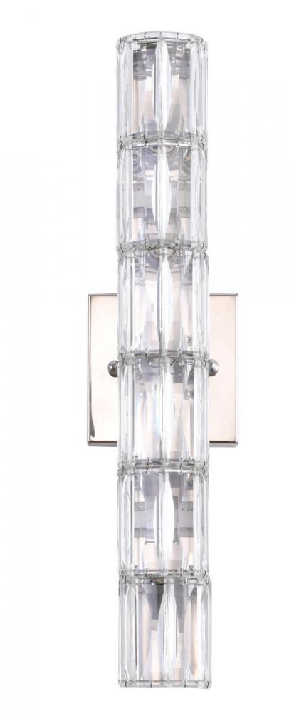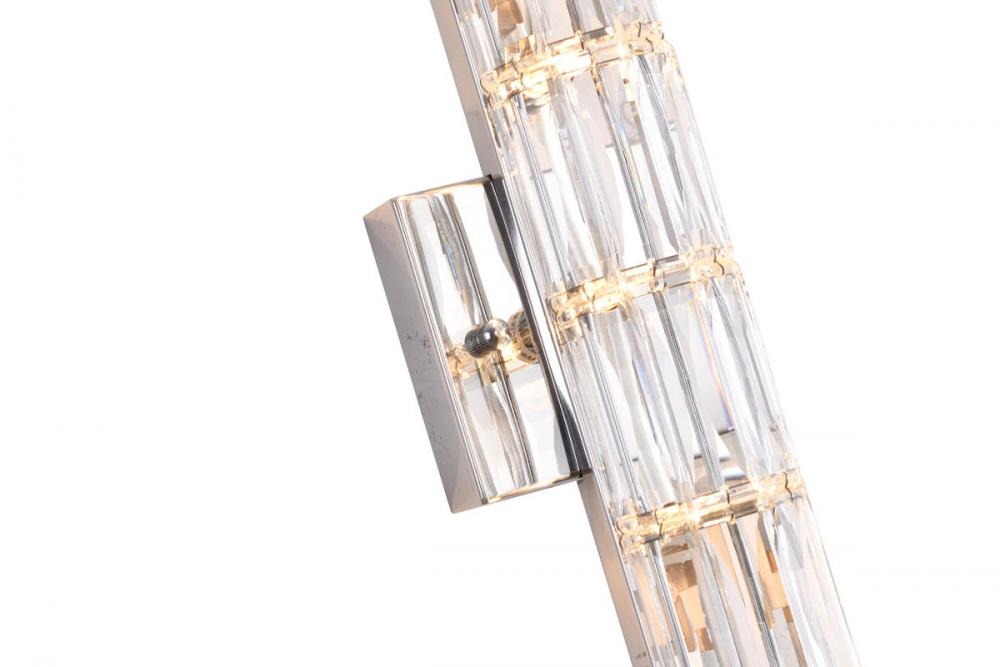 This exquisite wall sconce is in a chrome finish. The frame is made out of metal, and it comes with clear crystal cylinder. It can be mounted horizontally or vertically, and it also can be used in bathroom.