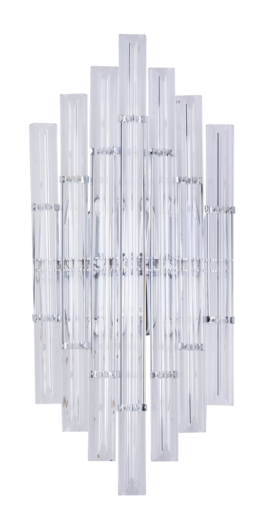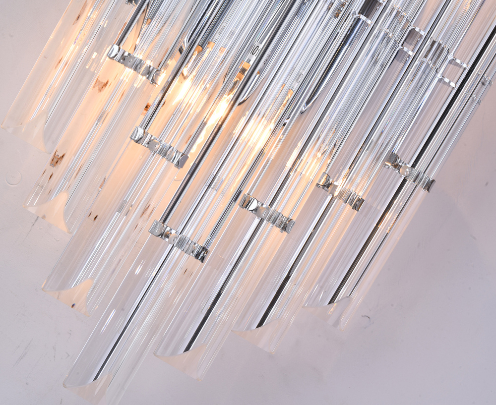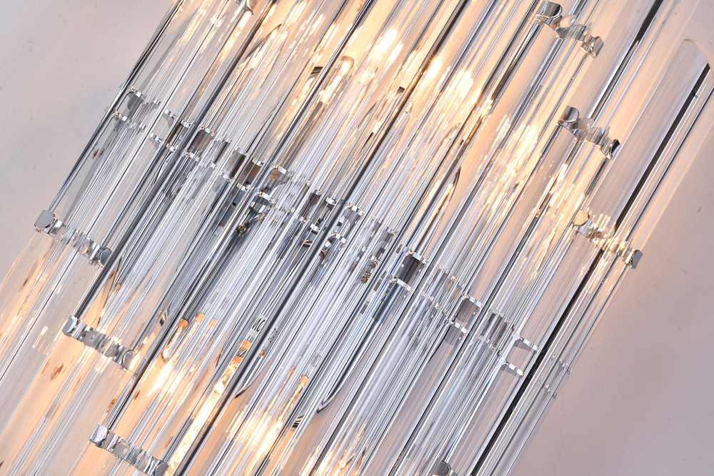 This exquisite wall sconce is in a chrome finish. The frame is made out of metal, and it comes with clear glass rods. It can be mounted horizontally or vertically, and it can be used in any rooms, entryways, and more.