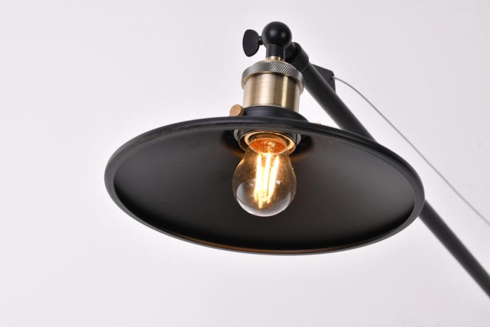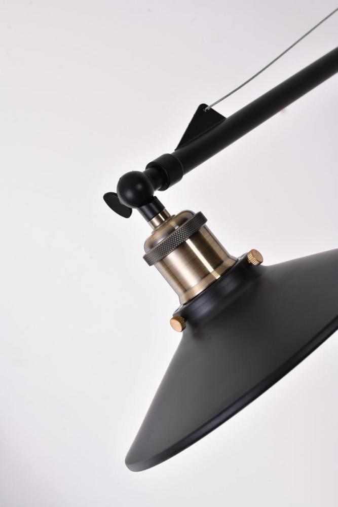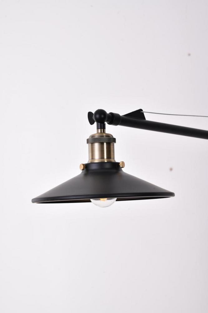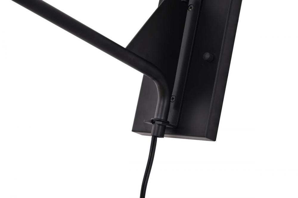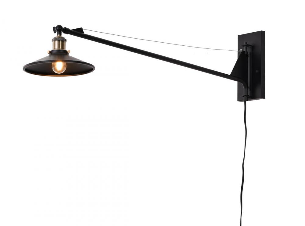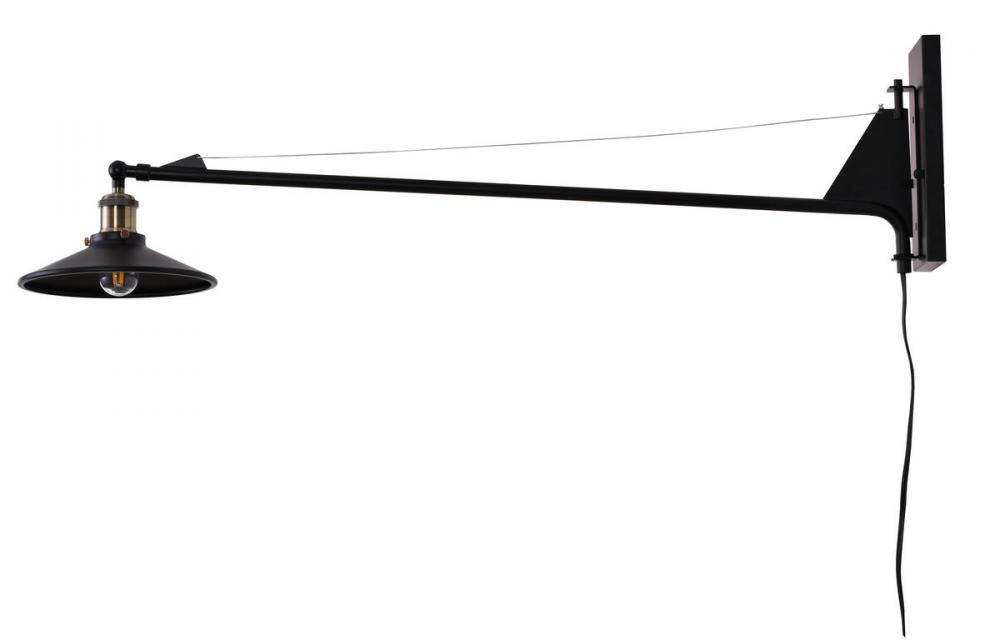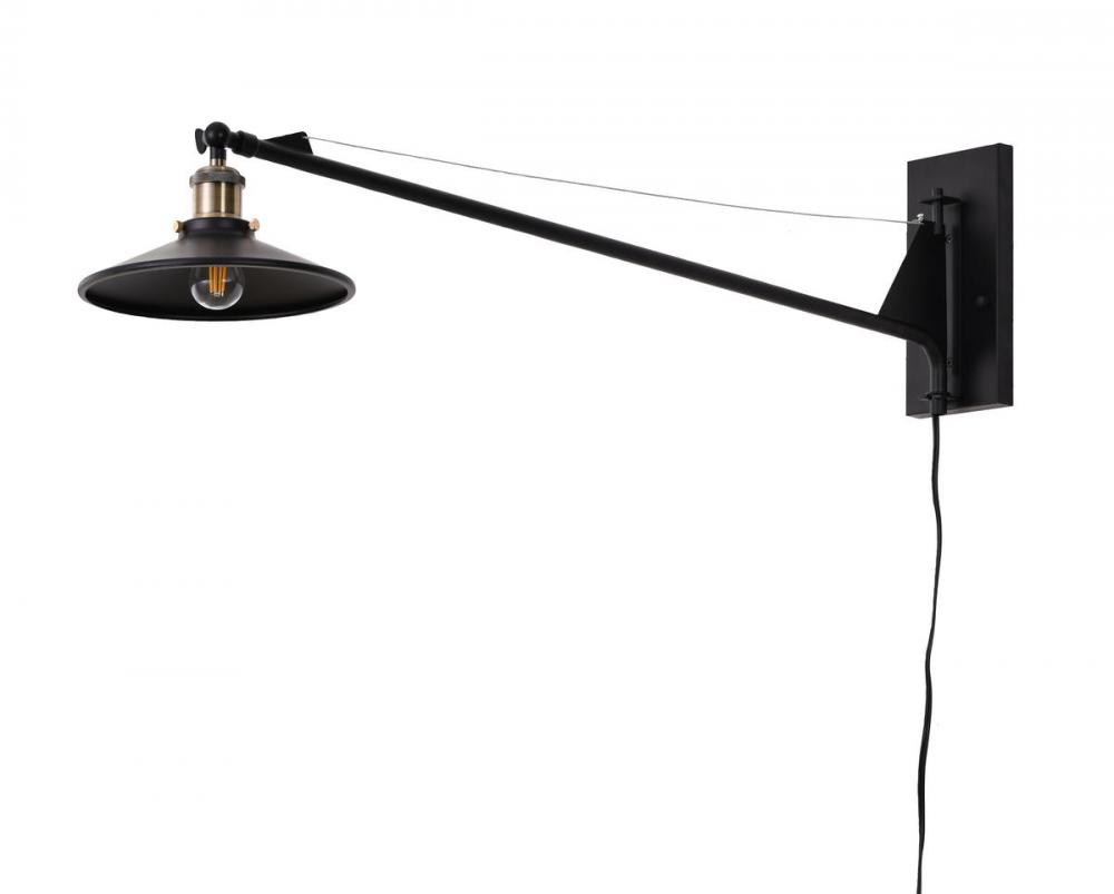 This wall sconce is in a black finish. The frame is made out of metal, and it comes with antique brass hardware. The arm can be moved to different directions, and it also comes with a plug.
