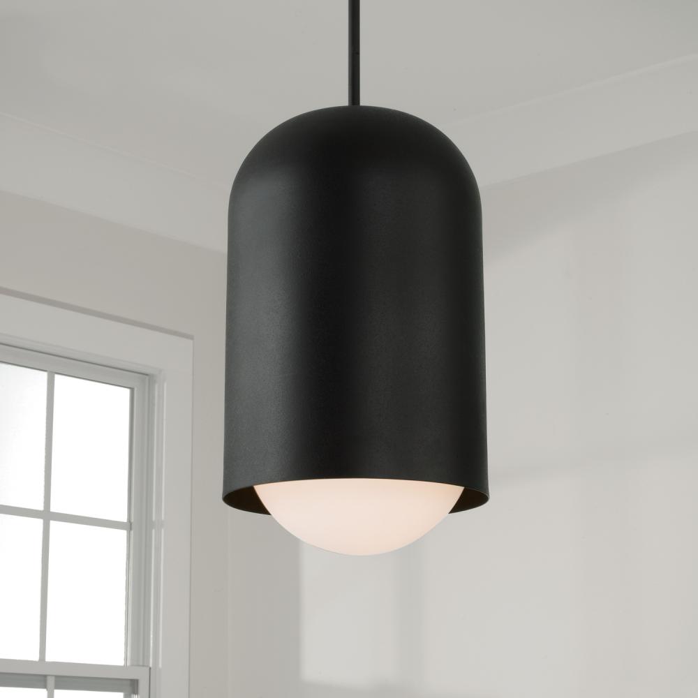 The streamlined Dolby 1-Light Pendant evokes retro chic style with Soft White glass topped with the metal capsule shade. The textured Black Iron finish creates dimension and punctuates any space.