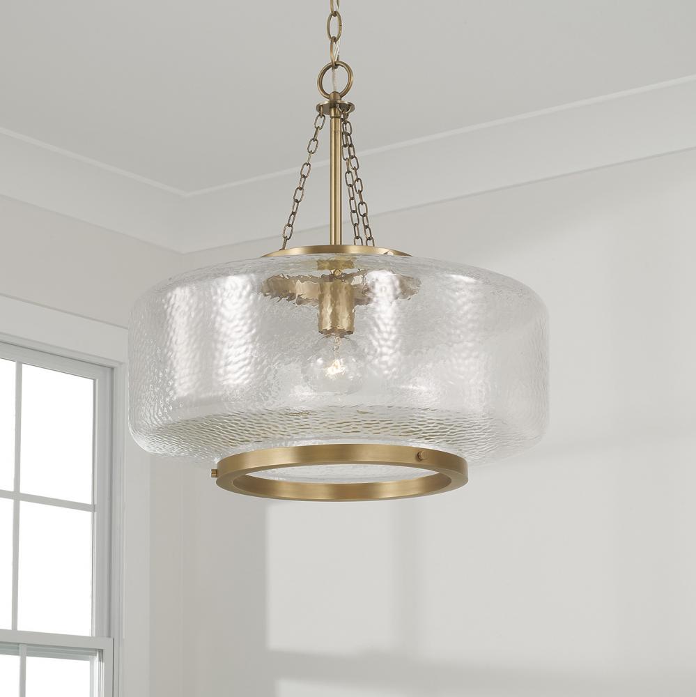 1-Light Cloche Pendant in Aged Brass with Organic Hammered Glass