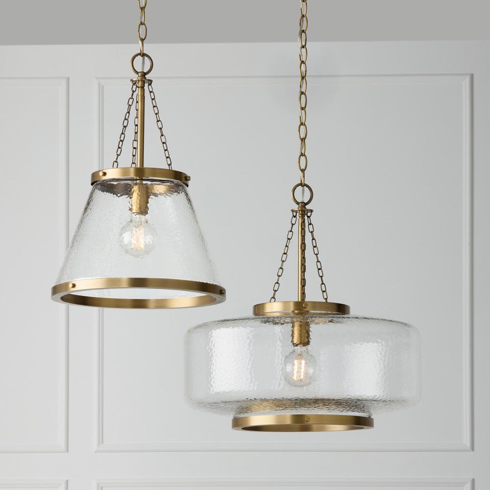 Illuminate stunning style in any space with the Landon Cone Pendant. Suspended from small chains, the organic ripple glass creates textural appeal that casts a unique glow, while the Aged Brass details perfectly complement the clear, captivating silhouette.