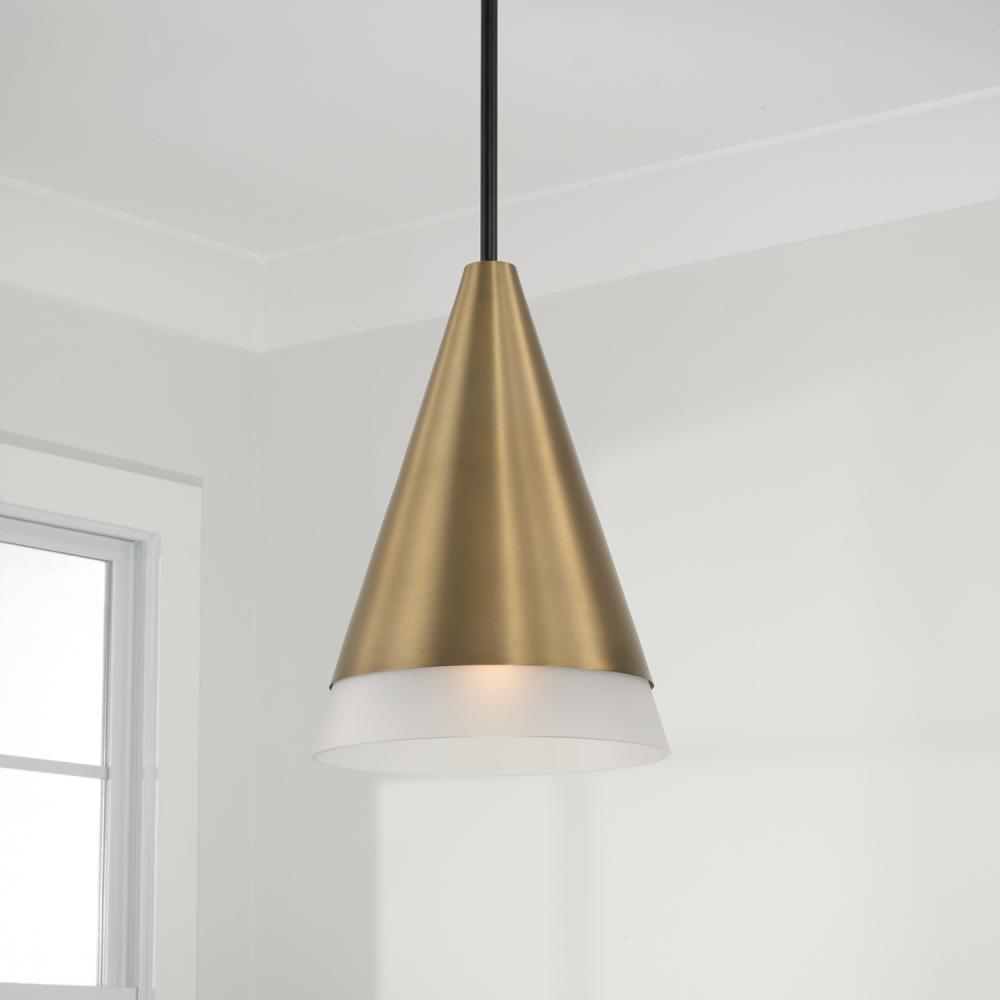 Create striking elegance in any space with the Avant Pendant. The pointed Aged Brass metal shade widens to a ring of Soft White glass to create an all-around stunning glow. Finished with Matte Black details, this luminaire evokes a distinct style.