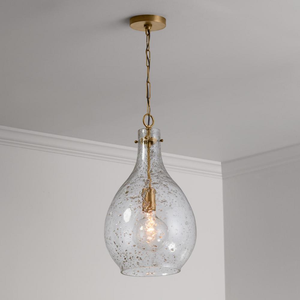 Handcrafted and designed with detail, this 1-Light Teardrop Pendant is a one-of-a-kind, artisan fixture. The Patinated Brass finish complements the natural variation of the stone seeded glass for a unique light pattern day or night.